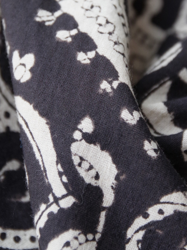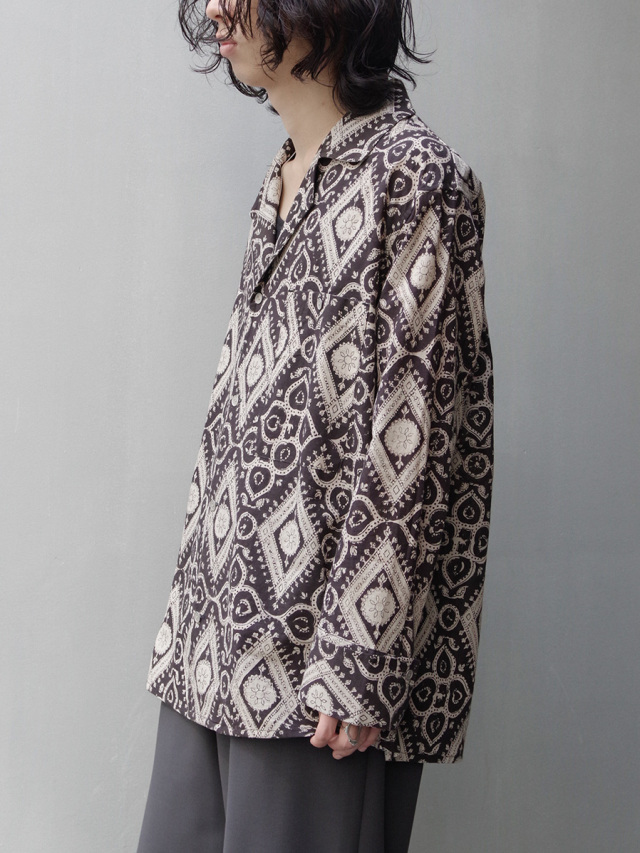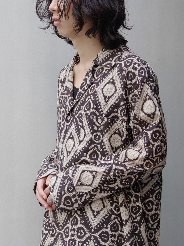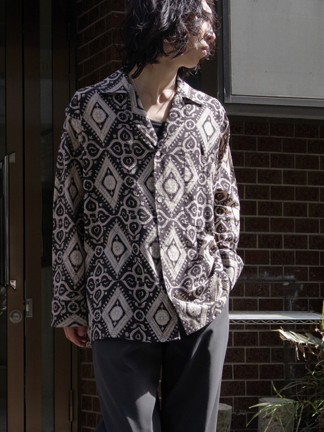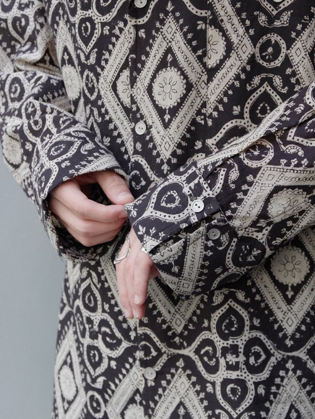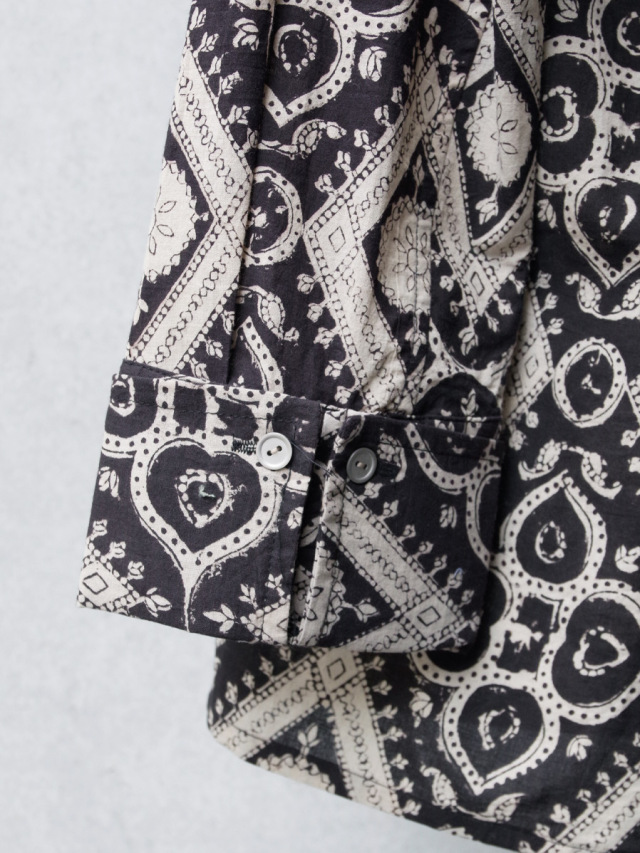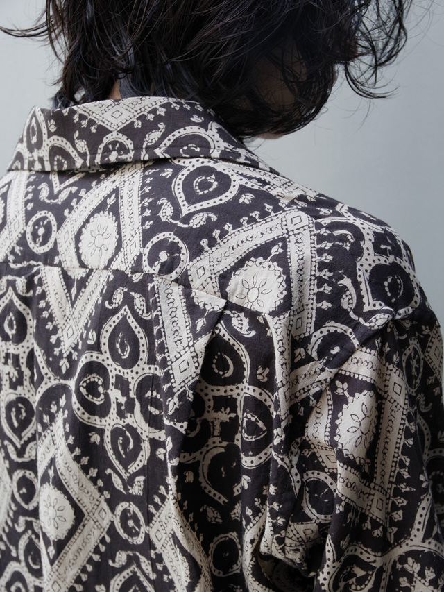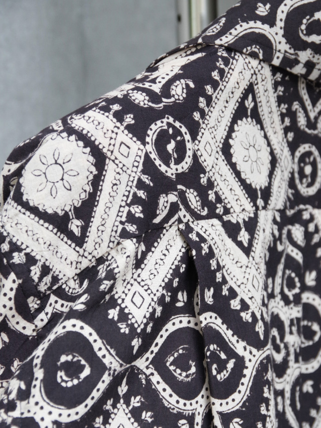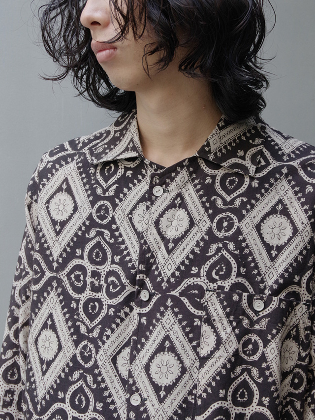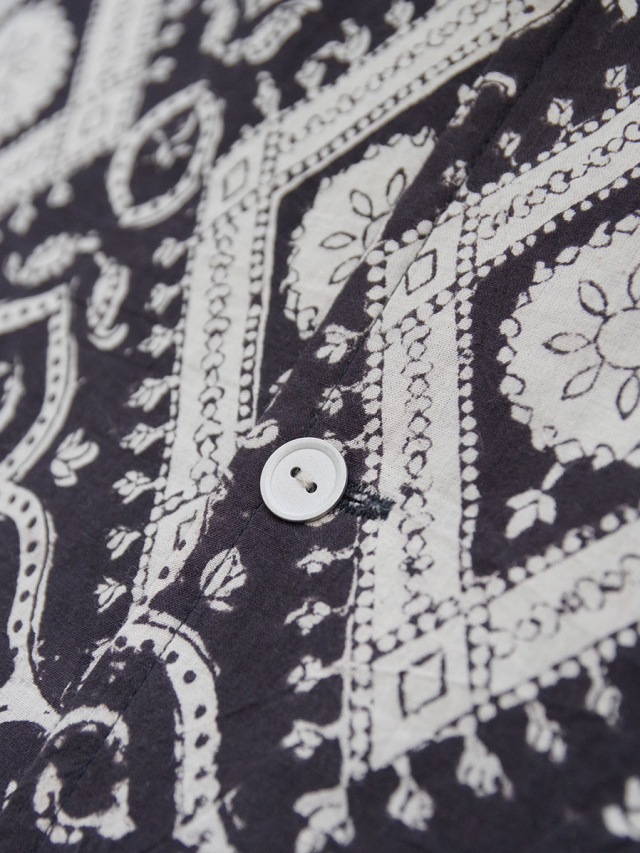 古くからインドにて伝統工芸として伝わるブロックプリントという手法で製作された、ブランドオリジナルのテキスタイルを採用したオープンカラーシャツ。