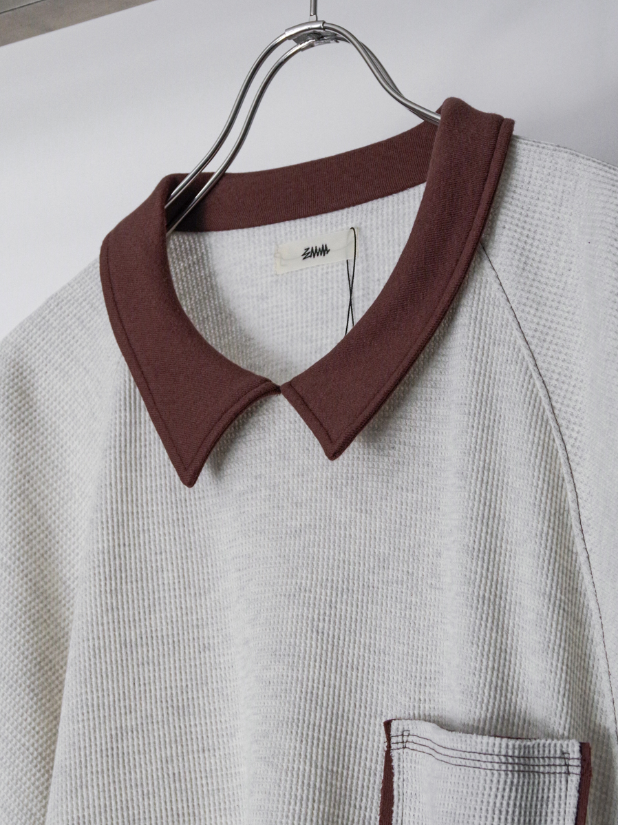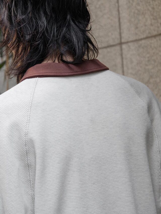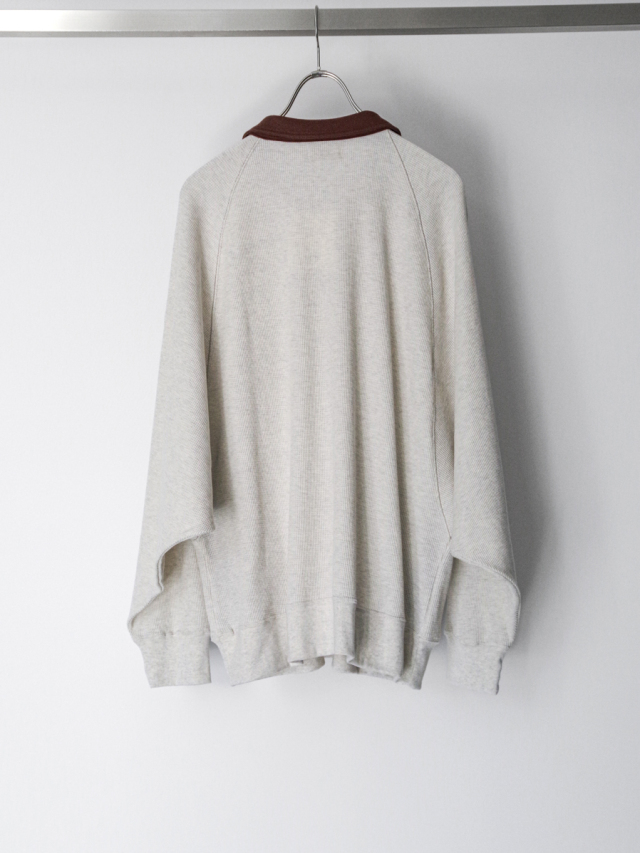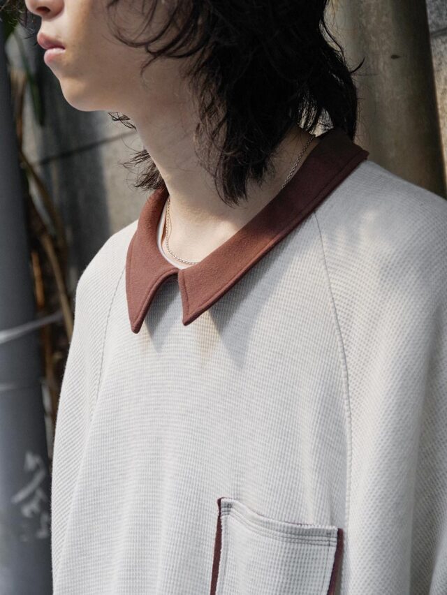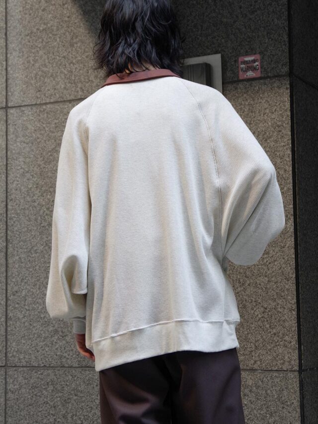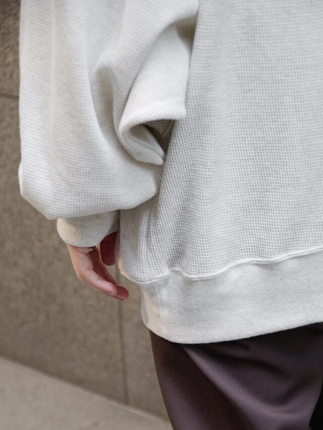柔らかく快適なワッフル素材を使用し、カットソーとしてもスウェットのようにも活用できる汎用性の高い一着です。くったりとした生地の落ち感が自然なドレープを生み、ニュアンスのある着こなしを楽しめます。