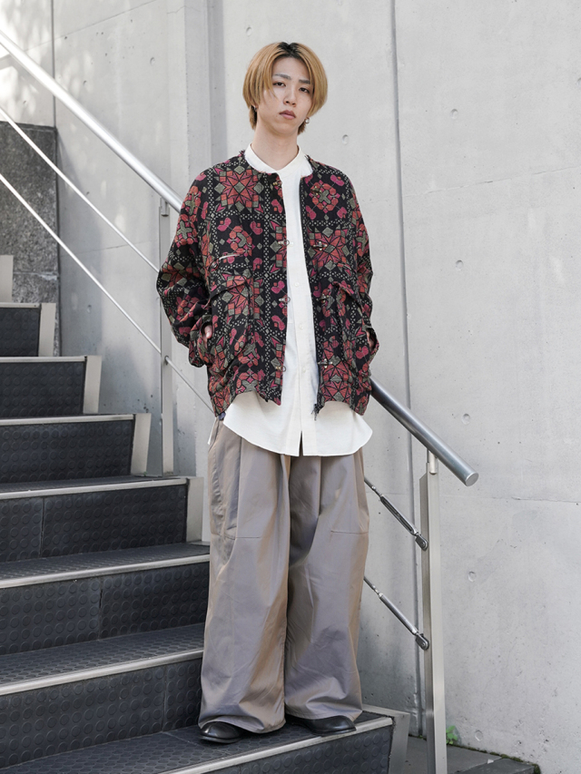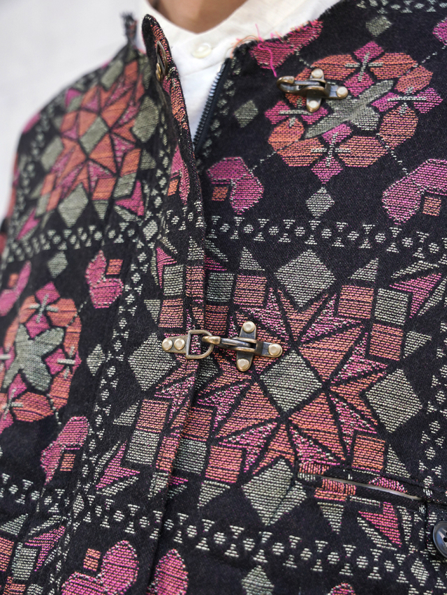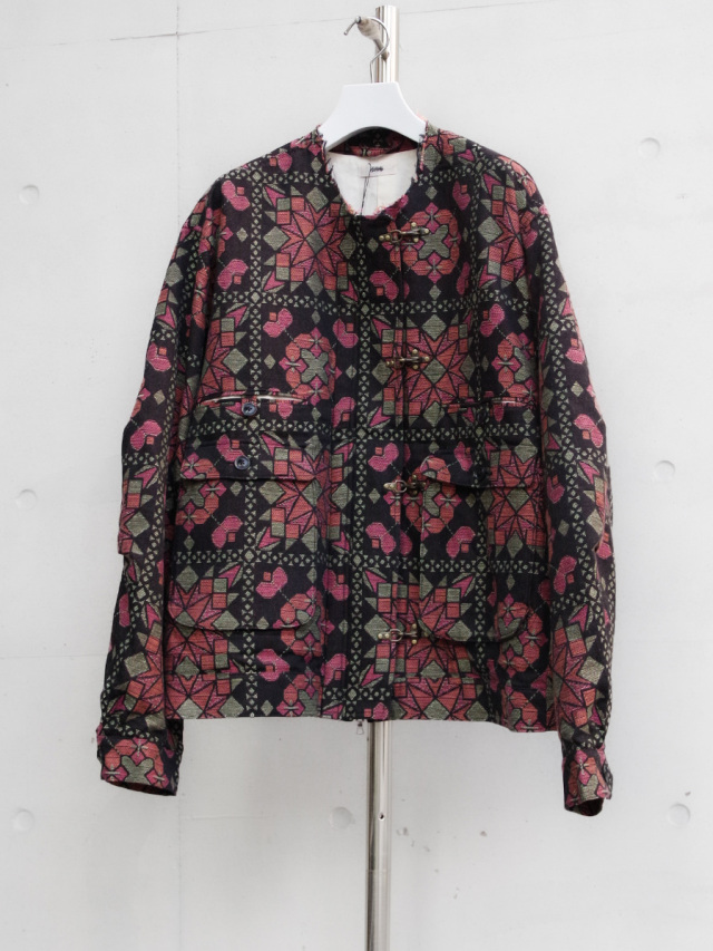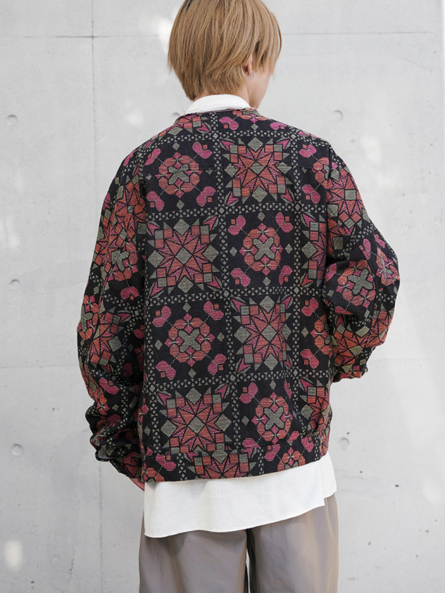 オリジナルのジャガード生地で製作されたブルゾン。柄は日本の伝統的な寄木細工の図形をモチーフに、タイル状に構成。従来の寄木のカラーとは対照的なビビッドなカラーチョイスでエッジを感じさせる柄になっています。