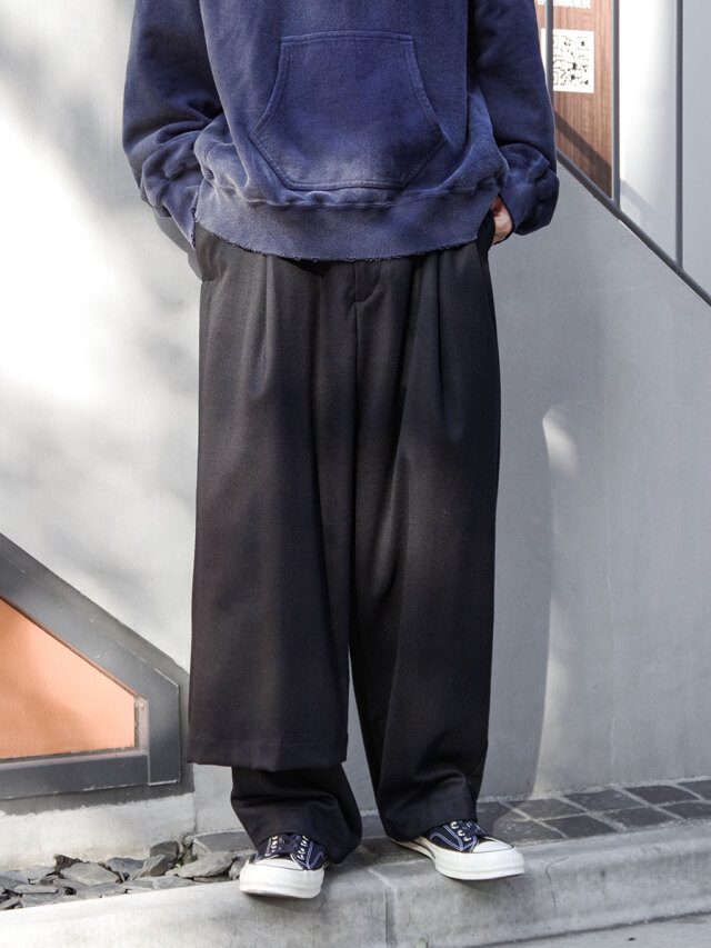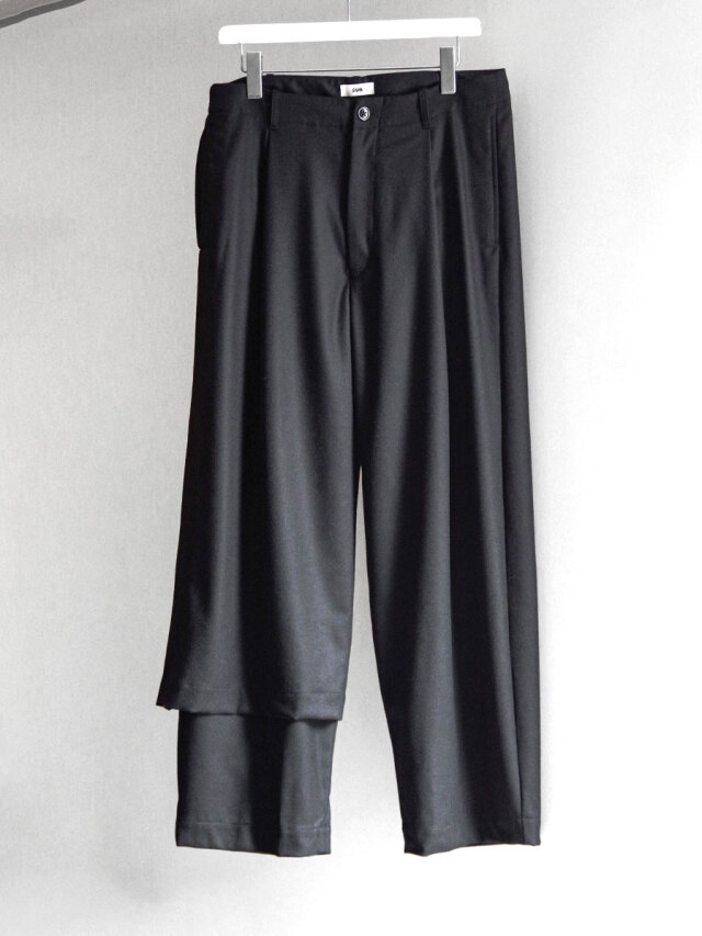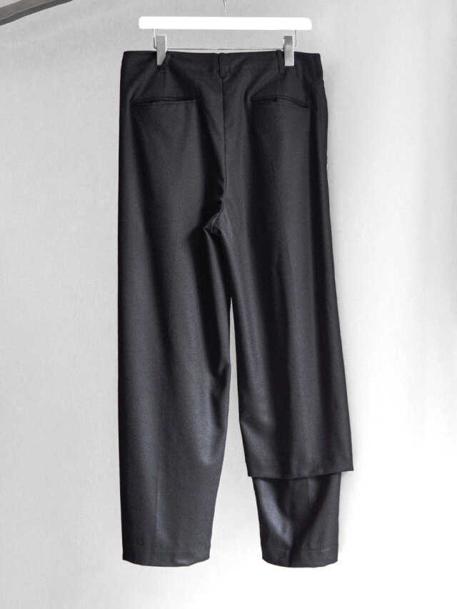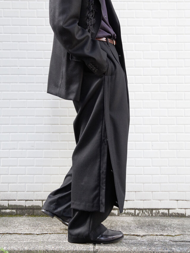 シルエットはワイドストレート。最大の特徴は、右足のみがフルレングスとクロップド丈の二重構造になったアシンメトリーデザイン。外側のクロップド丈には脇にボタンを備えており、開閉によってシルエットが広がり、歩くたびに動きのある表情を演出します。