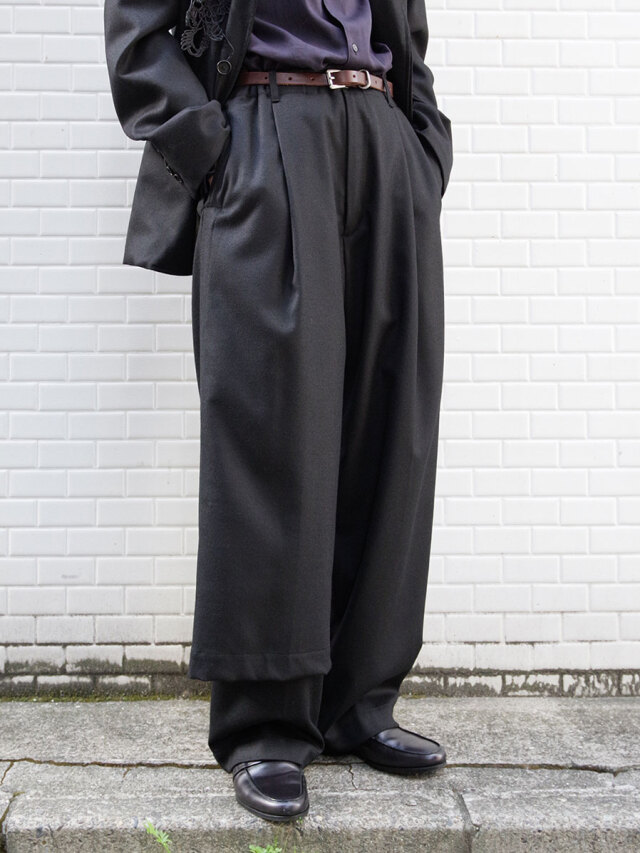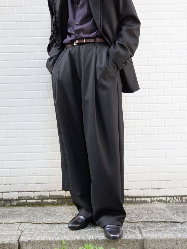 同素材のジャケットと合わせれば、他にはない存在感を放つセットアップスタイルが完成。単体でも十分な存在感を持ちながら、トータルでの着こなしではブランドらしい独創性をより鮮明に表現できる一本です。