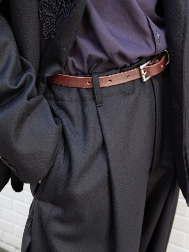 繊細で上質なウール糸を高密度に織り上げたフラノ素材を使用したスラックス。ハリ感と美しい光沢を併せ持つ表面は上品な佇まいを引き立て、秋冬らしい気品ある雰囲気を漂わせます。