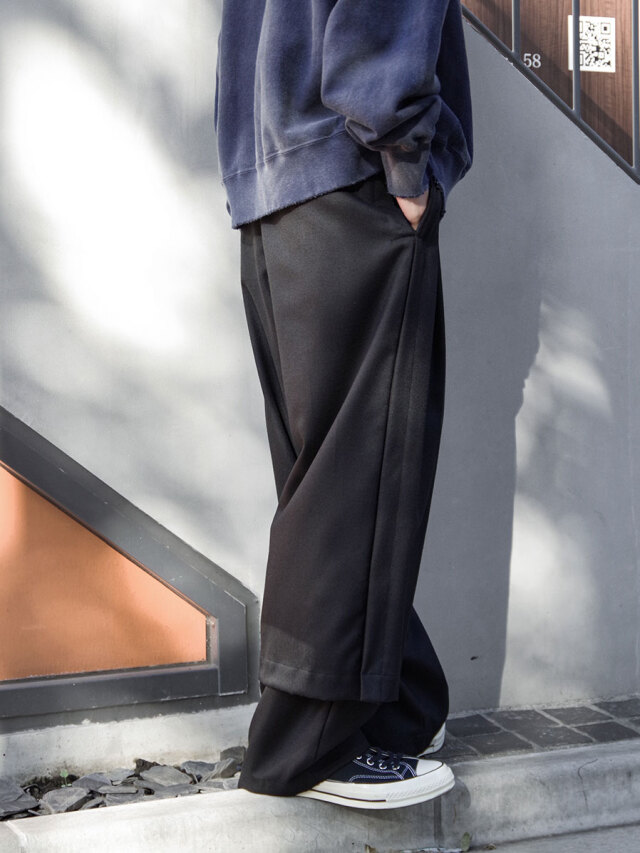 The silhouette is a wide straight, distinguished by a unique design: the right leg features a double-layer construction with both a full length and a cropped overlay. Along the cropped layer’s side, functional buttons can be opened to expand the shape, creating a more dynamic, flowing silhouette in motion.