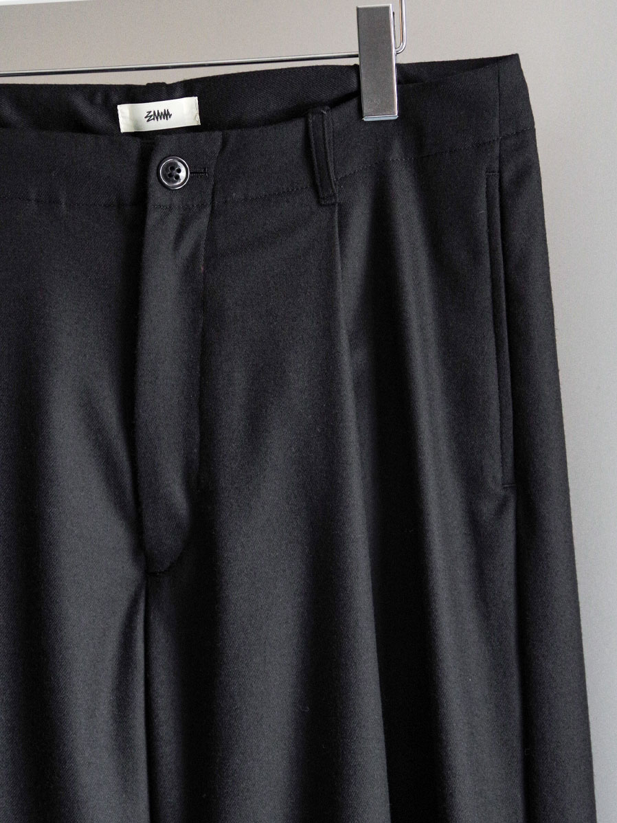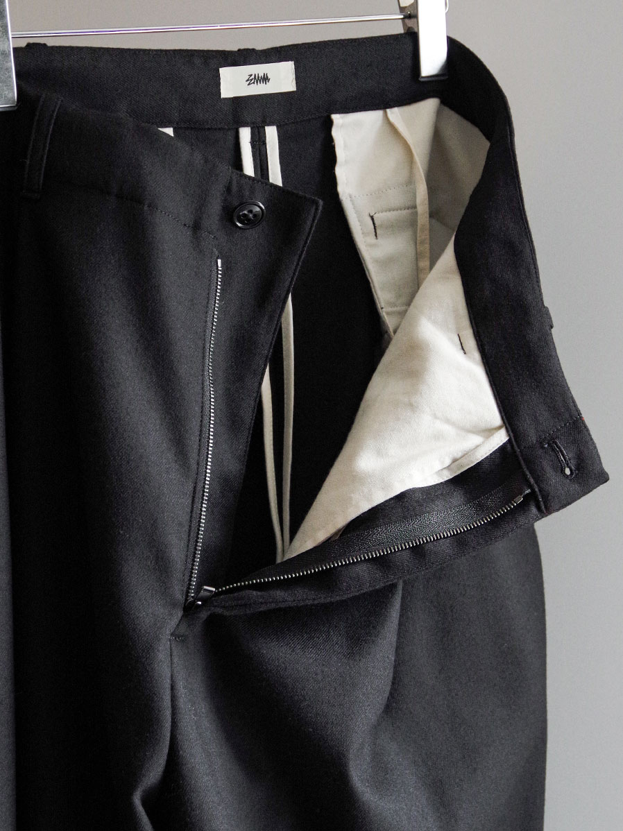 These trousers are crafted from fine, high-quality wool yarn, woven densely into a flannel fabric with natural firmness and a refined sheen. The smooth surface and elegant texture give the piece a sophisticated and luxurious presence.