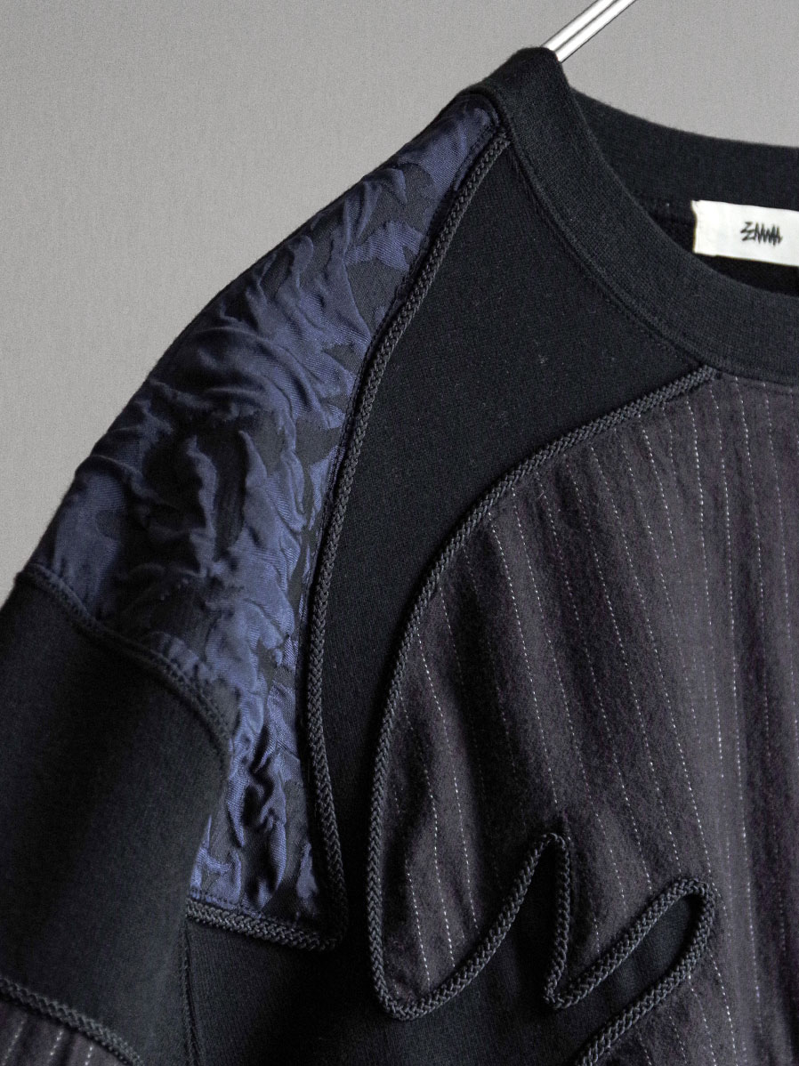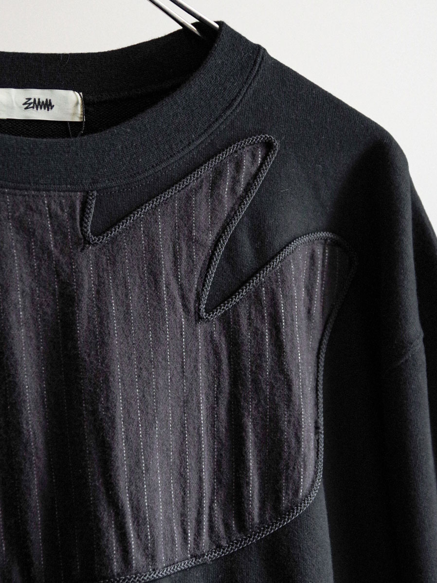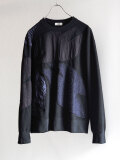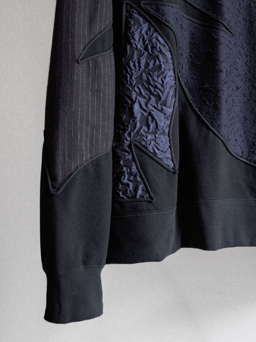 多種類の素材を組み合わせたパッチワークを全体に施し、縁取り部分にはコードを叩きつけることで立体感を強調したプルオーバースウェット。手仕事を強く感じさせる、手間と時間を惜しまず仕上げられたクラフト感溢れる一着です。