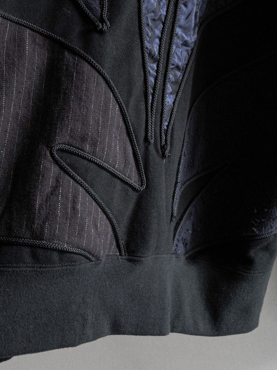A pullover sweatshirt finished with patchwork made from multiple materials, each piece outlined with cord to emphasize depth and dimension. The result is a playful, artisanal design that reflects the time and care poured into its creation.