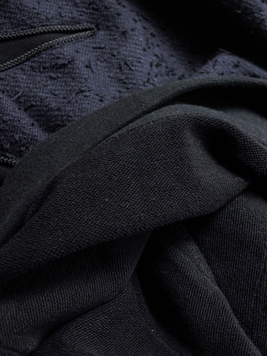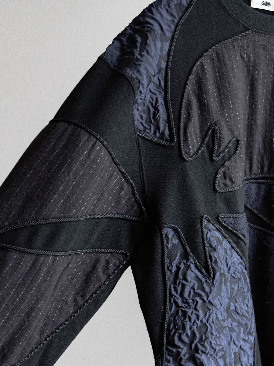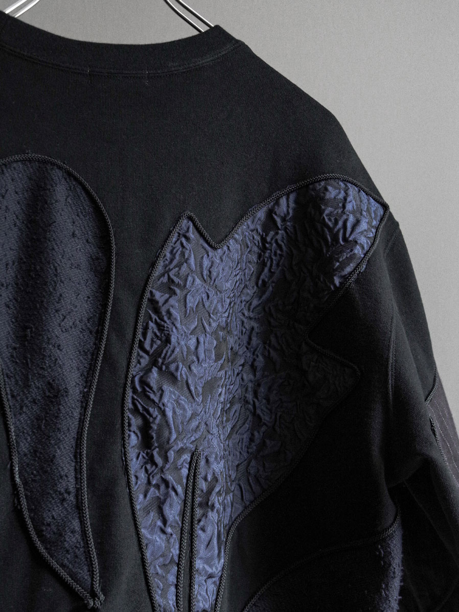 Practical details include side pockets, adding functionality to its striking design. It works as a statement piece on its own, yet also pairs effortlessly under outerwear, where the patchwork details still shine through. Layering it over a shirt further enhances its dimensional look, making this sweatshirt a versatile piece that combines craftsmanship, comfort, and contemporary edge.