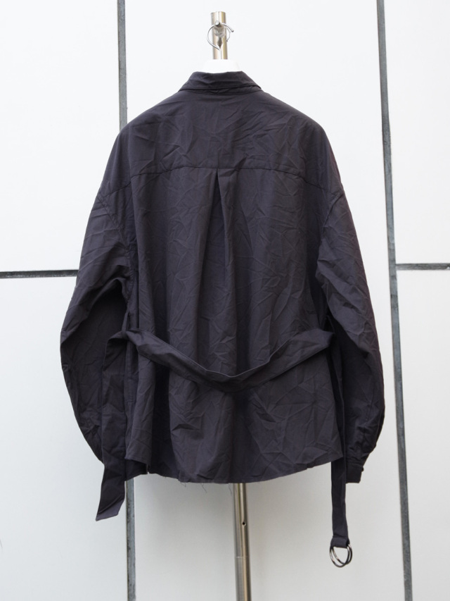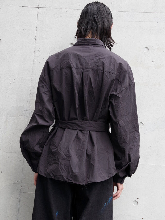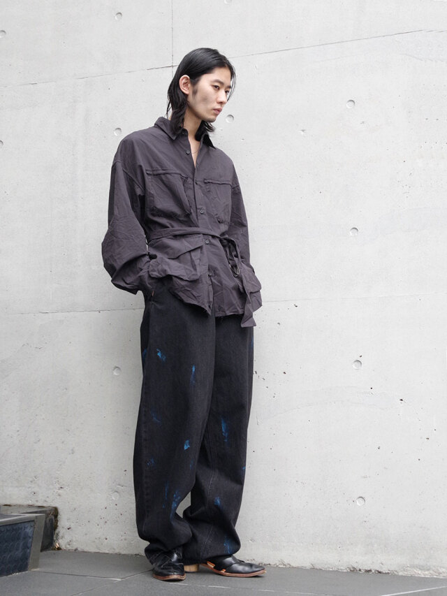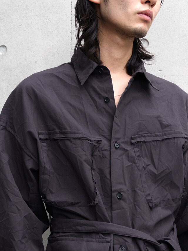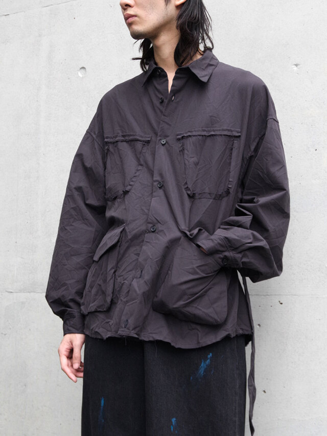 クラッシュ加工を施したサファリシャツ。両胸の剥ぎ取られたポケットのデザインがアイコン。