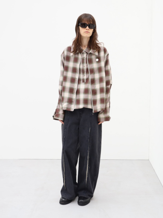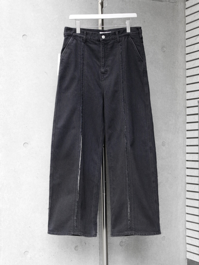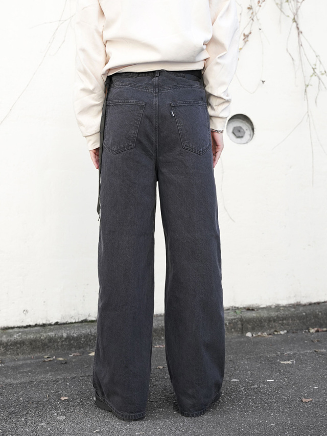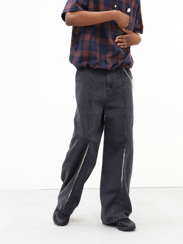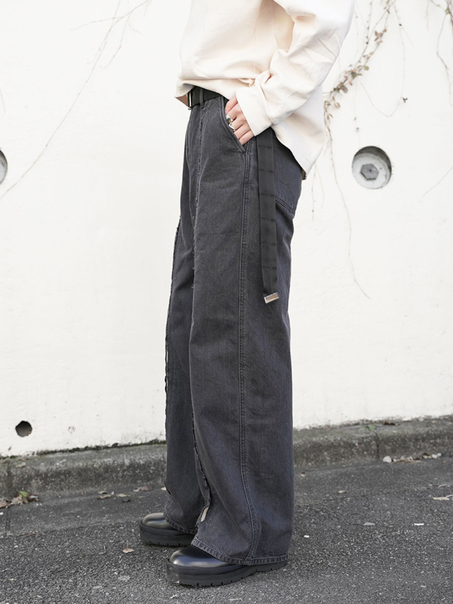 フロントのカッティングワークが特徴的なワイドデニムパンツ。