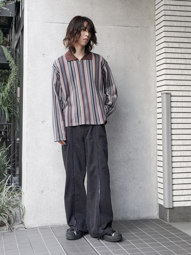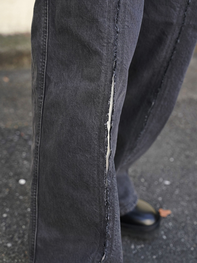 自然とセンタークリースのような見え方にもなり、デニムでありながらスラックス然とした上品な印象にも。オリジナリティあるデザインで周りと差をつけられる一品です。