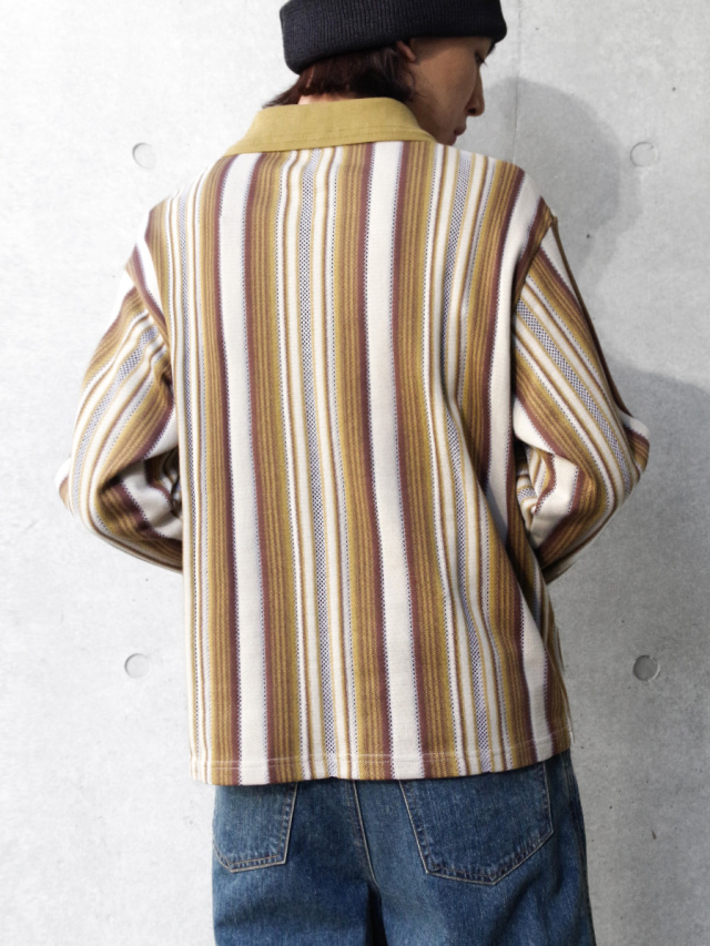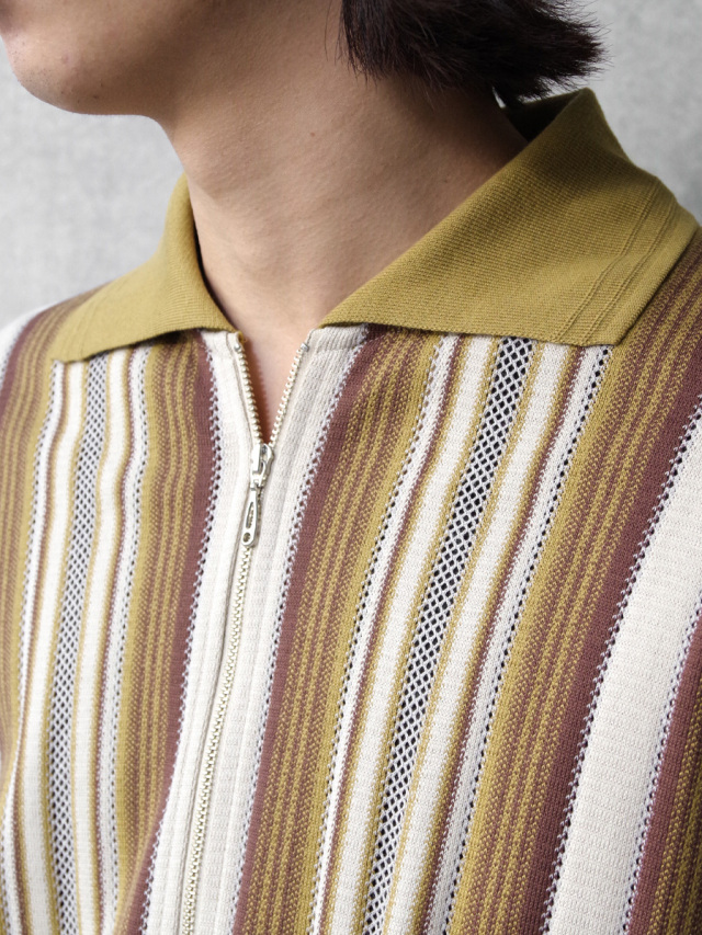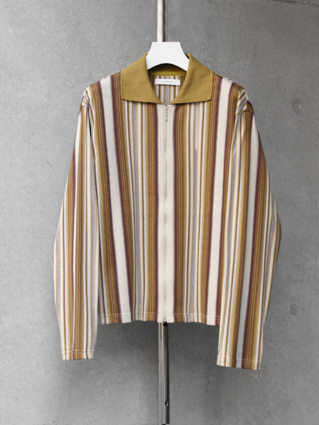 シャツとニットを合わせた様な使い勝手で、カーディガンとしてさらっと羽織った着こなしもおすすめ。フロントはジップアップ仕様で、水平に切り替えられた単色の襟が印象を引き締めます。