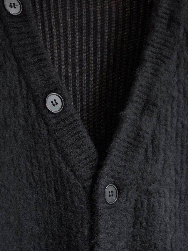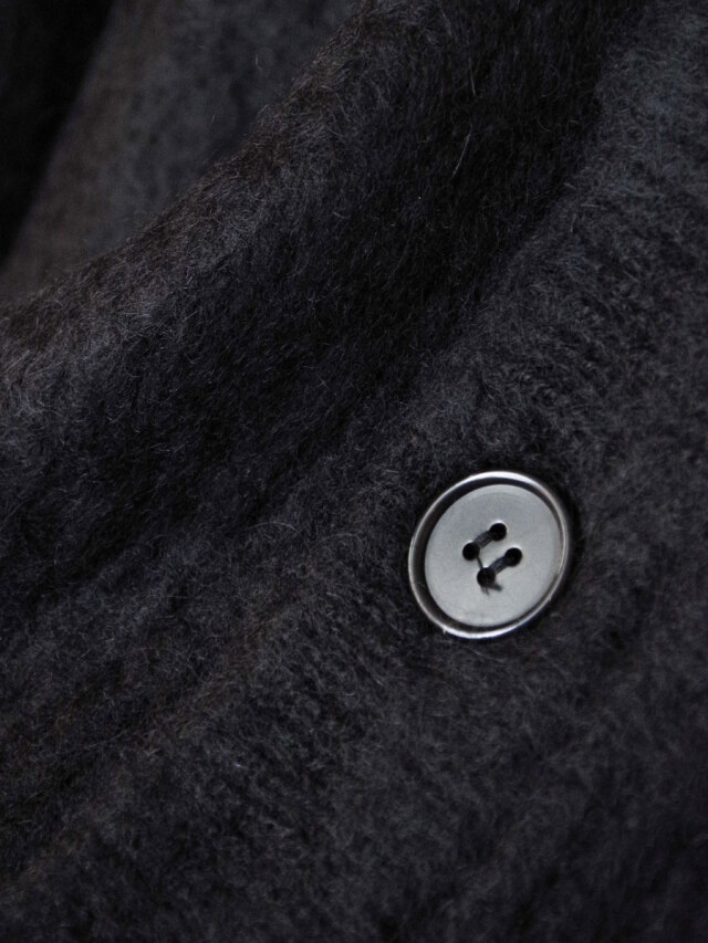 起毛加工をかけたニットカーディガン。高混率でベビーアルパカを使用した贅沢な素材使いとなっており、保温性だけでなく全くのストレスを感じさせない軽やかな着心地です。釦には本水牛釦を採用し細部までJUHAの拘りが詰まっている他、生地感と相まってナチュラルな柔らかさを全体として纏めています。