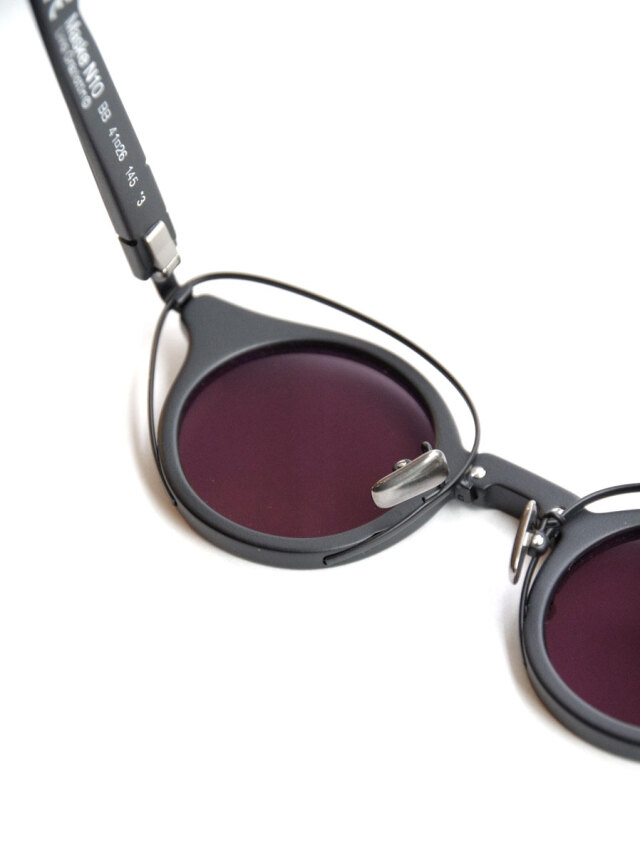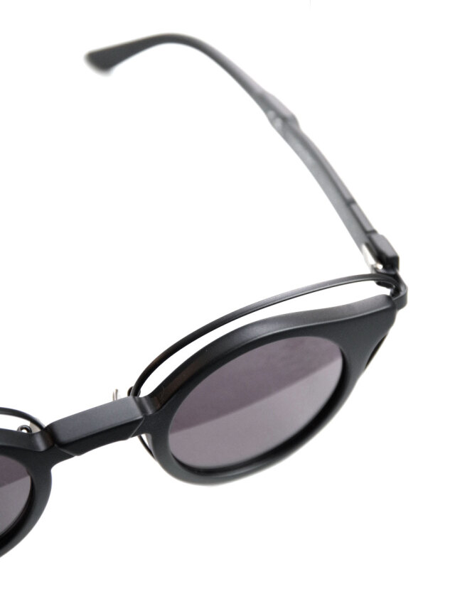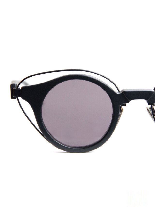 ラウンドタイプのレンズとそれを覆うやや細めのマットな質感のフレームで構成されたサングラス。