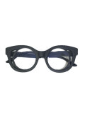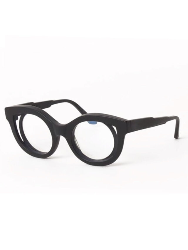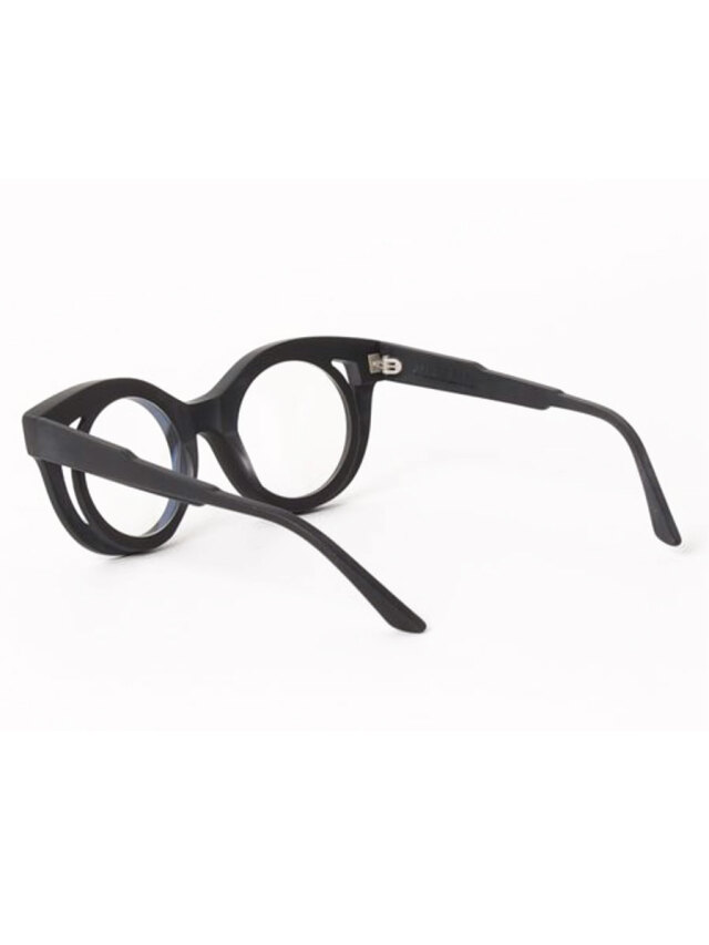 ウェリントンタイプのかけやすいフレームデザインをベースにしながらも、フレーム上で段差をつけたり、角ばらせた存在感あるフォルムデザイン。ベルリンらしい建築学的なアプローチで成形されたシルエットは、洗練されたファッションアイテムとしての存在感を高めている。レンズカラーはクリア。ツヤありのブラックフレーム。