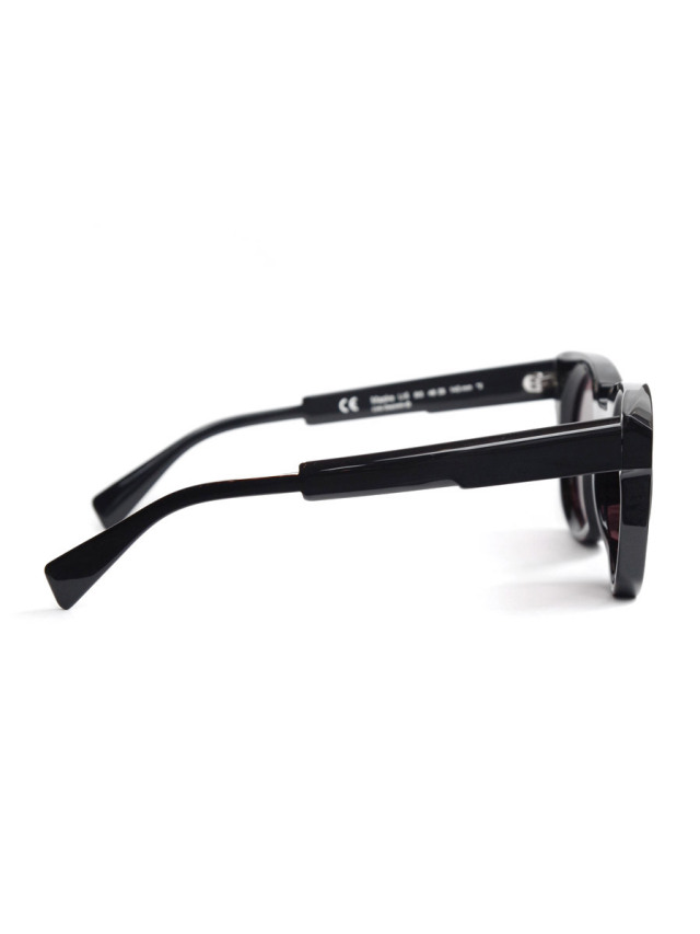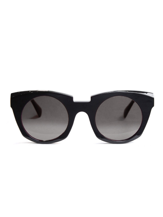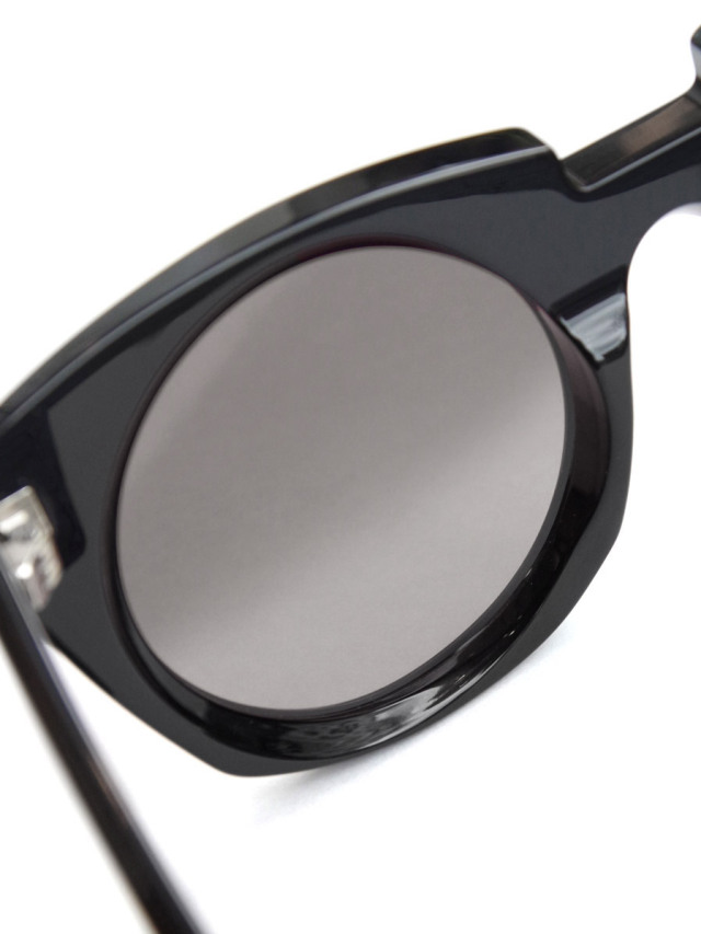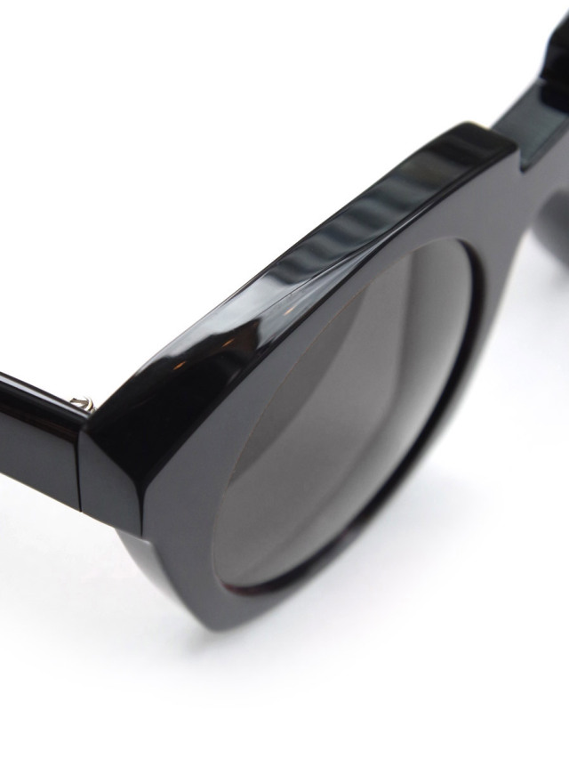 ややキャッツアイ形状をイメージさせつつも、フレーム上部を斜めにカット、下部のカーブをいびつに描いたエッジのきいた独創的なフォルムが印象的。レンズ自体をラウンド形状にすることで繊細な柔らかみをプラスしている。ベルリンらしい建築学的なアプローチで成形されたシルエットは、洗練されたファッションアイテムとしての存在感を高めている。