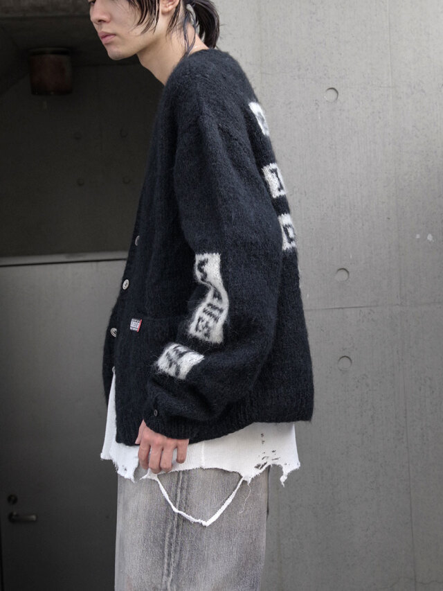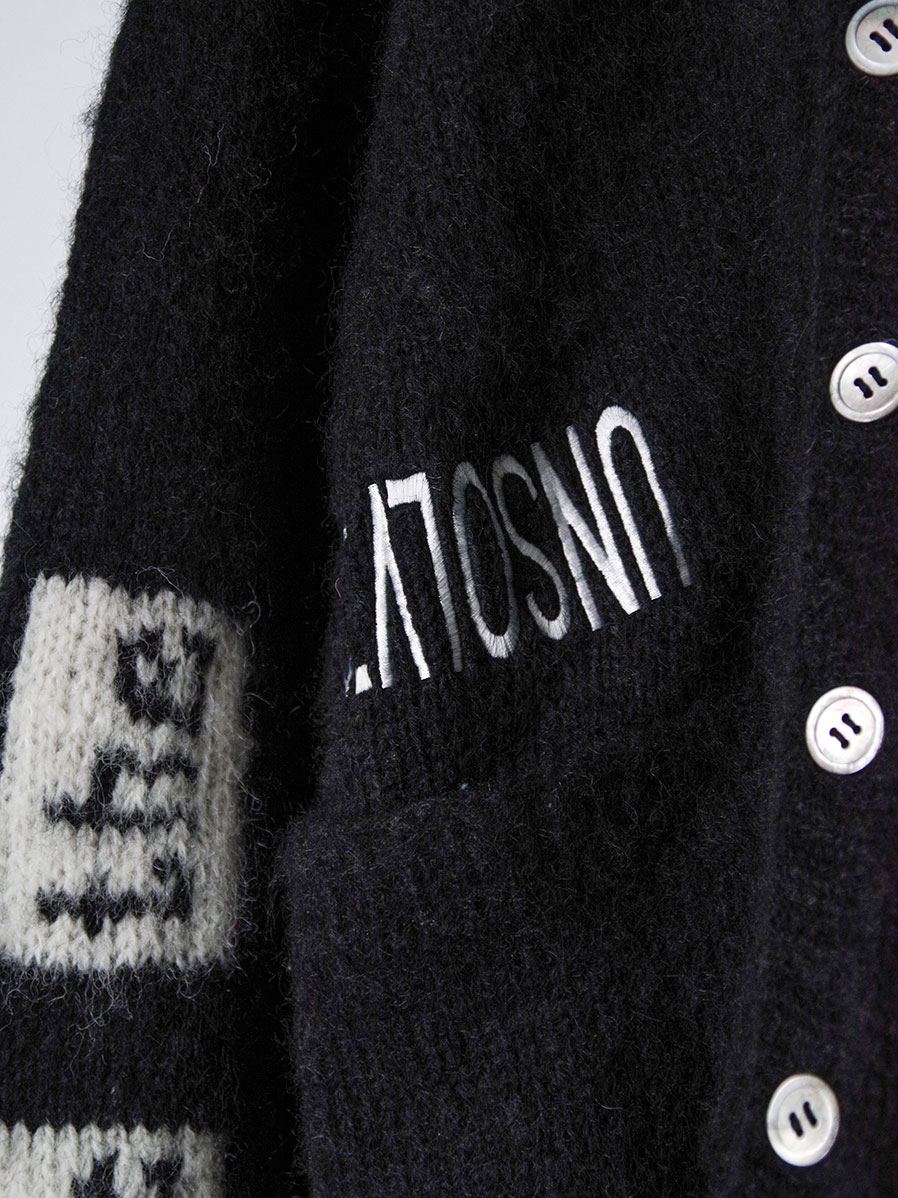 フロントには「UNSOLVED」の文字を敢えて反転させて刺繍。そこには「迷宮入り」の逆=「解決」という意味を込め、深いメッセージ性を宿した一枚。ファッションとしての強さとアートピースのような存在感を併せ持つ特別なカーディガンです。>