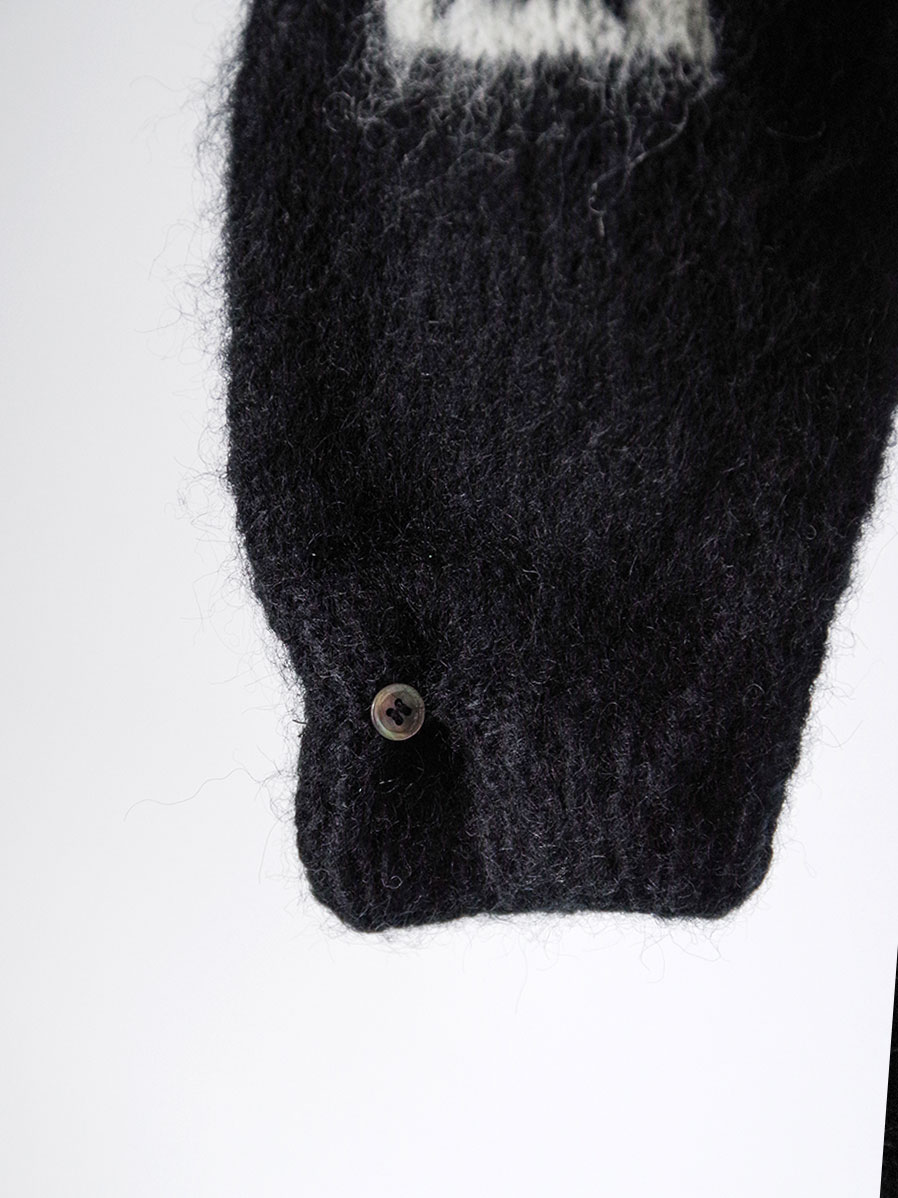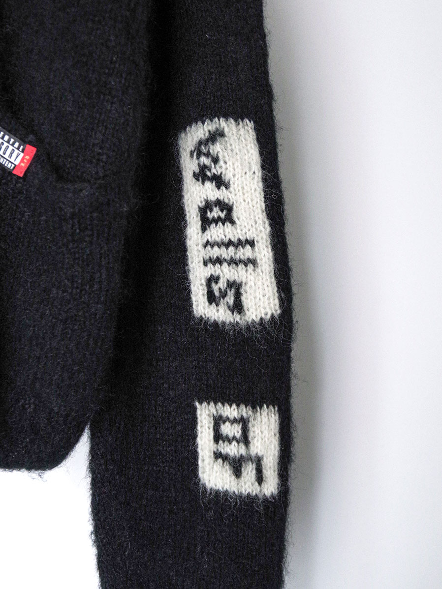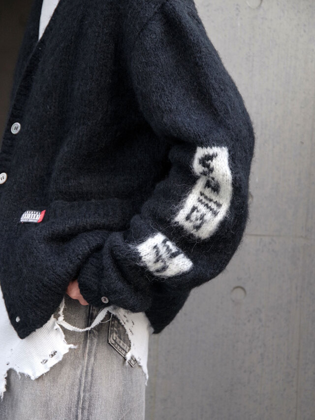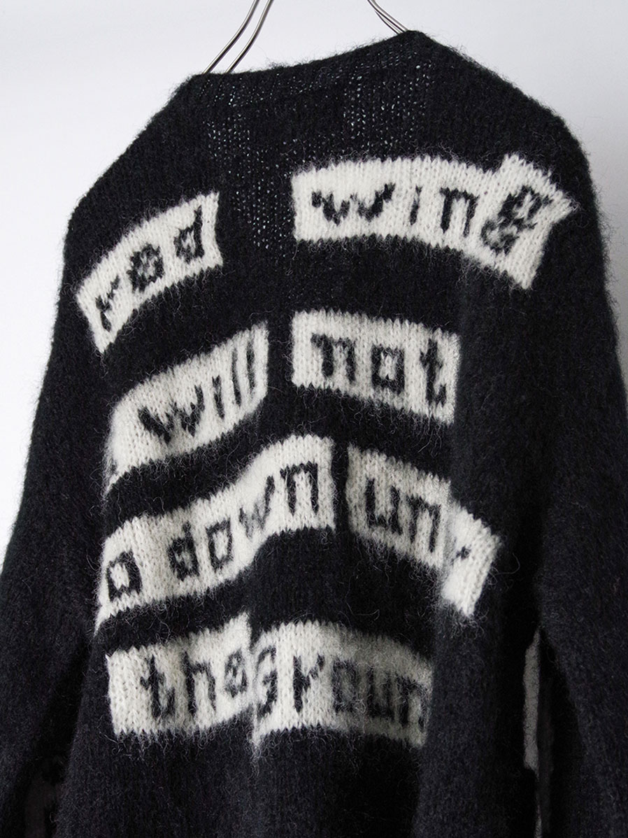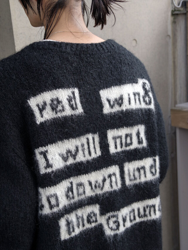 手編みで仕立てられた贅沢なモヘアカーディガン。袖と背中にはボブ・ディランの歌詞が編み込まれており、モヘアという素材で、しかも手編みで文字を表現するという高度な技術が詰め込まれています。>