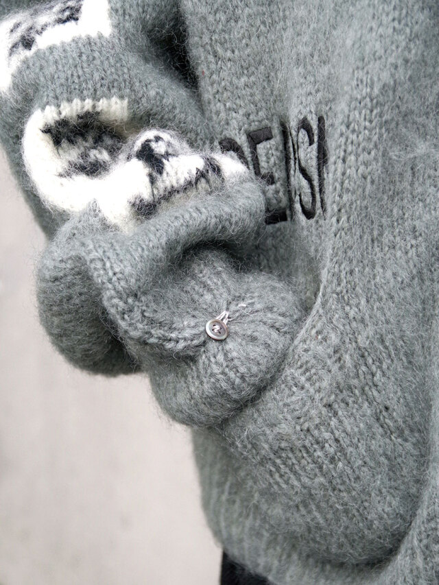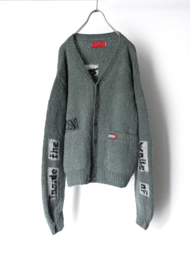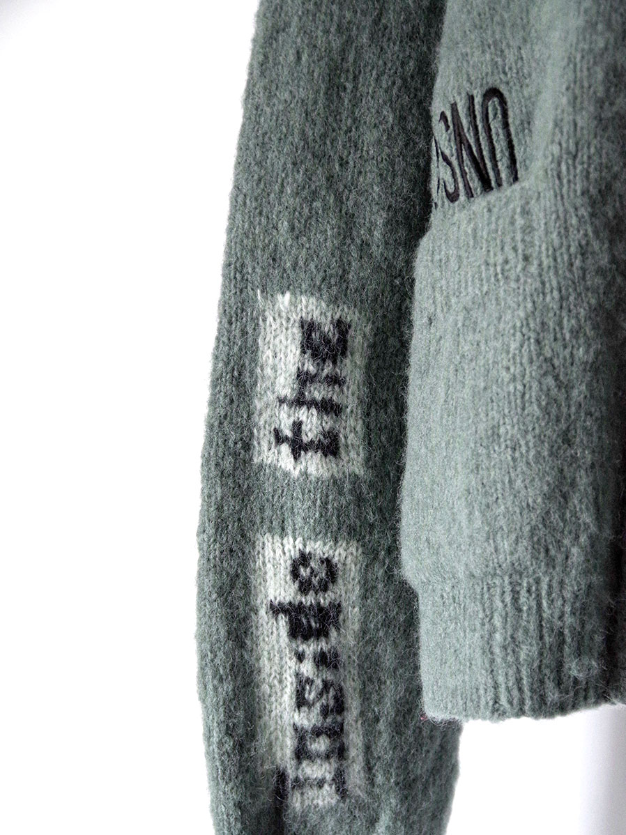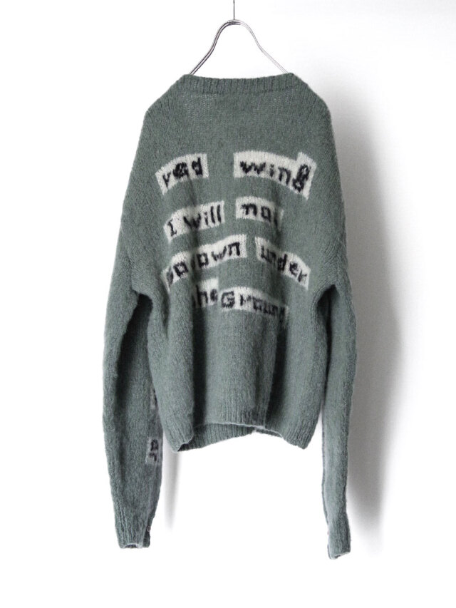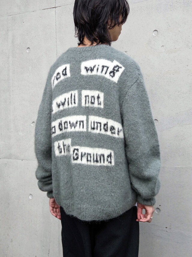手編みで仕立てられた贅沢なモヘアカーディガン。袖と背中にはボブ・ディランの歌詞が編み込まれており、モヘアという素材で、しかも手編みで文字を表現するという高度な技術が詰め込まれています。>