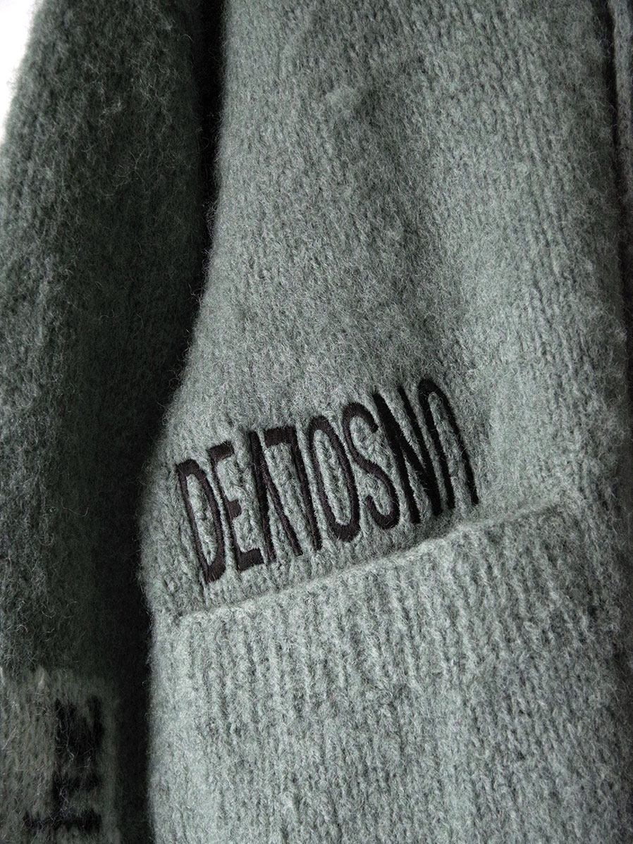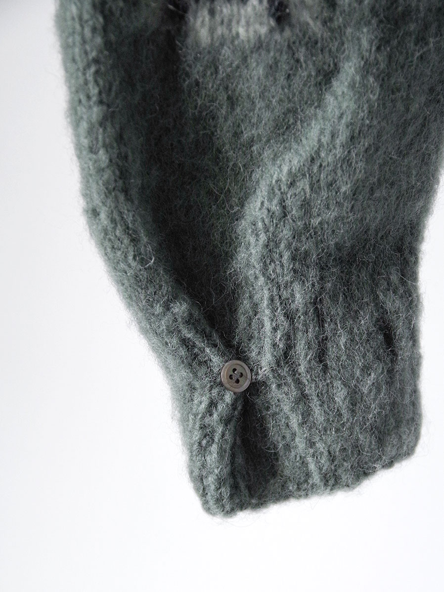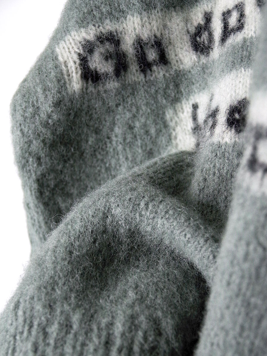 手編みで仕立てられた贅沢なモヘアカーディガン。袖と背中にはボブ・ディランの歌詞が編み込まれており、モヘアという素材で、しかも手編みで文字を表現するという高度な技術が詰め込まれています。>