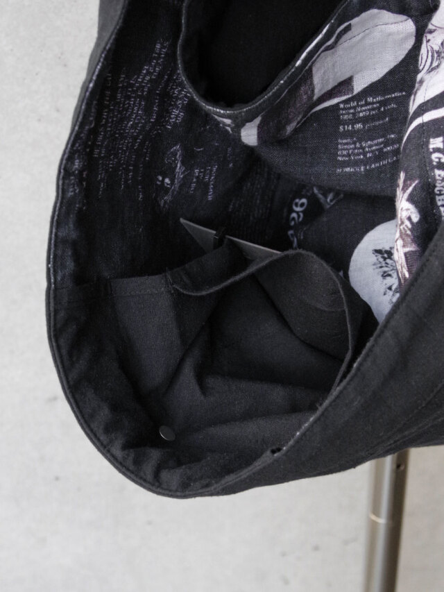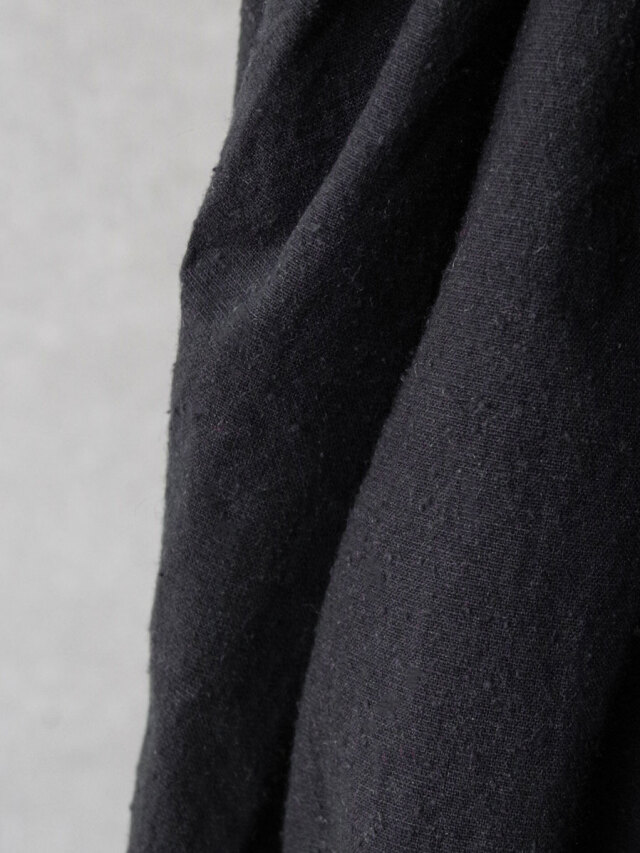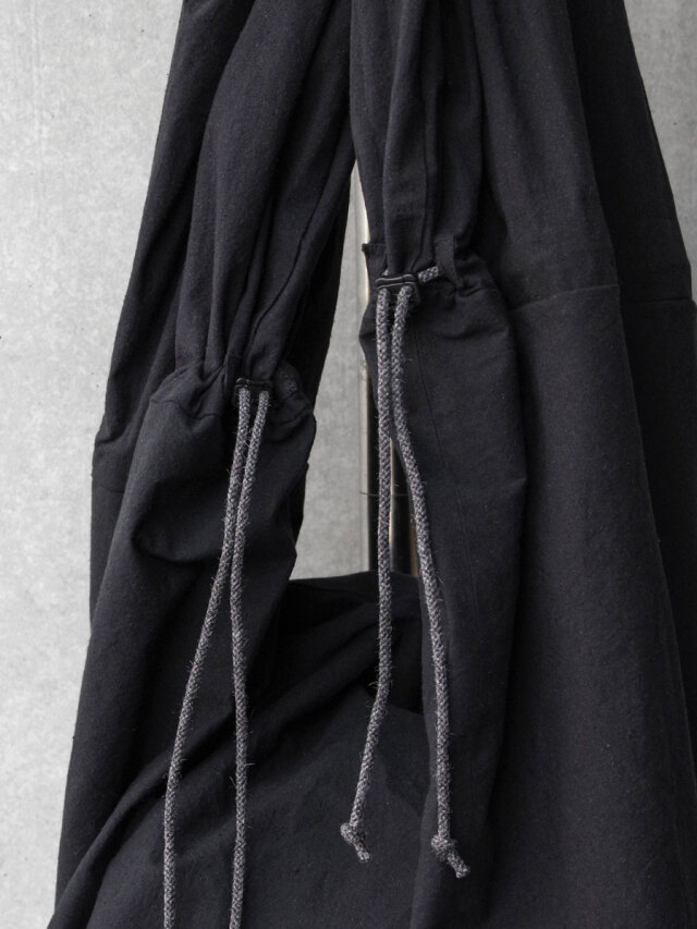 This piece is inspired by the kesa worn by Asian monks, and the silhouette can be adjusted with the drawstrings at the opening and obi. The end of the drawstring has a jump ring, which is perfect for attaching keys, and there is also a pocket inside for small items.