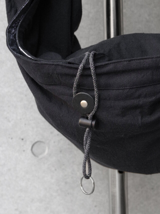 アジア圏の僧呂が身につける袈裟をデザインソースとした本作は、袋の入り口箇所と帯部分に設けられたドローコードでシルエットの調整が可能に。ドローコード先端には丸カンがつき、鍵などを取り付けるのにもぴったりで、内部には小分け用のポケットも配備されています。