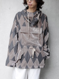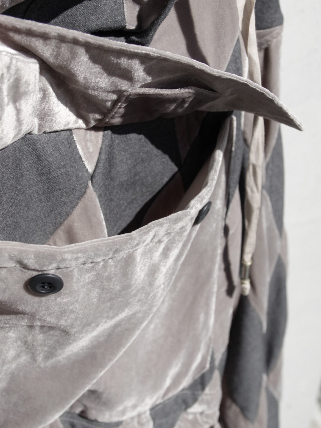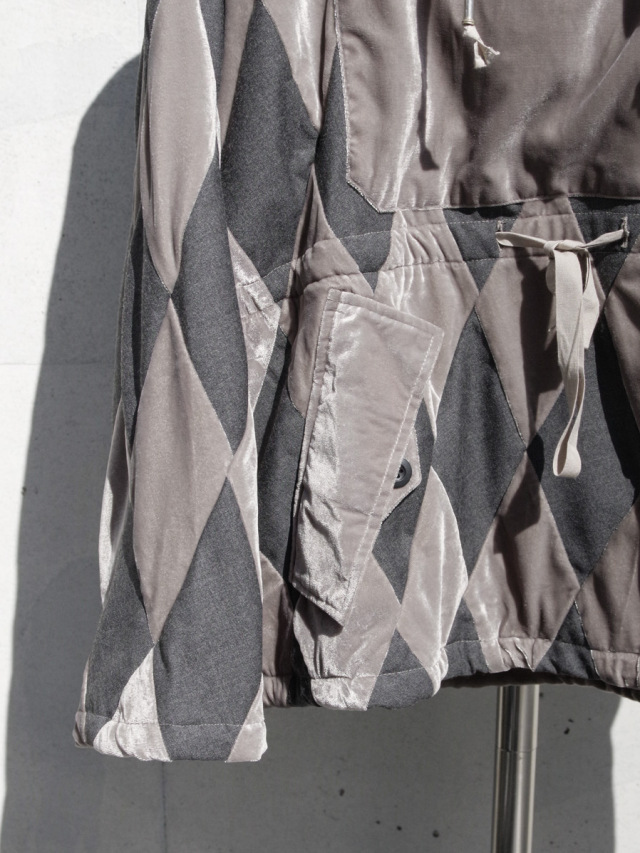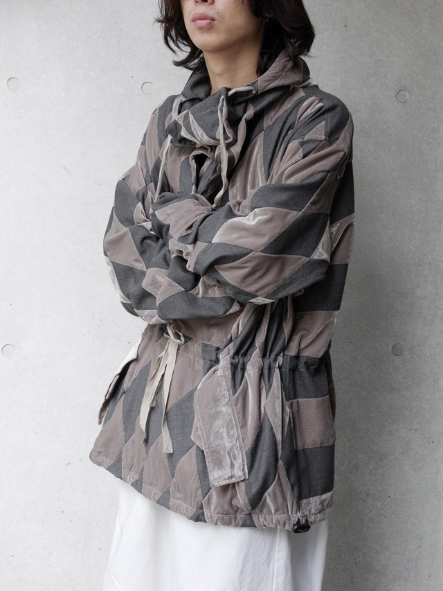 杢感のあるウール地と艶のあるベロア生地をダイヤモンド型に裁断し、パッチワーク状に縫い繋いだパーカ。非常に手間暇かけて製作された1着で、異素材のコンビネーションであることからも高い縫製技術も必要となるアイテムです。その異素材によって放たれる存在感は圧倒的なものがあり、スタイリングの主役を張る高いポテンシャルを持ち合わせています。