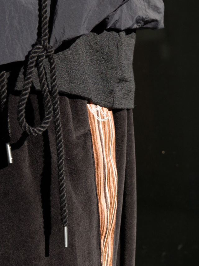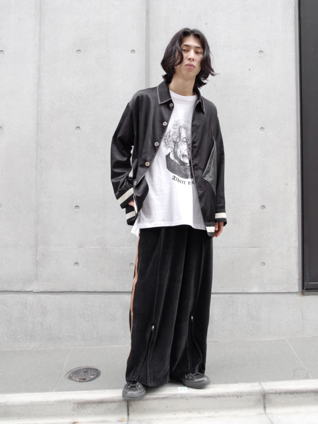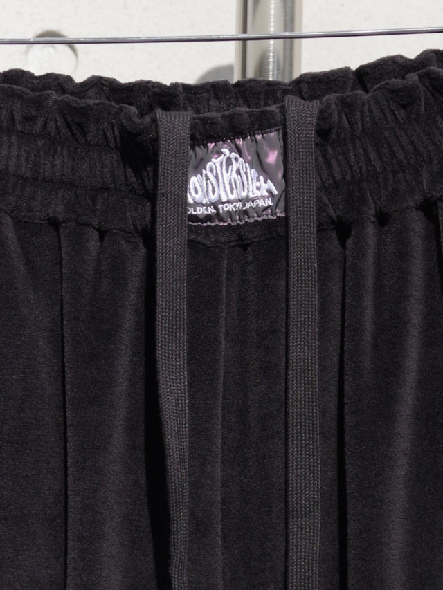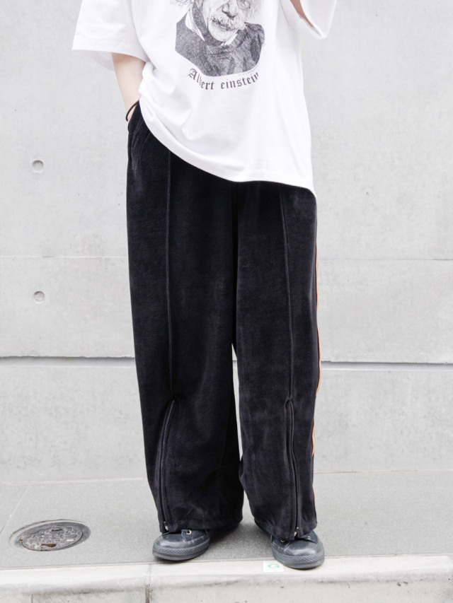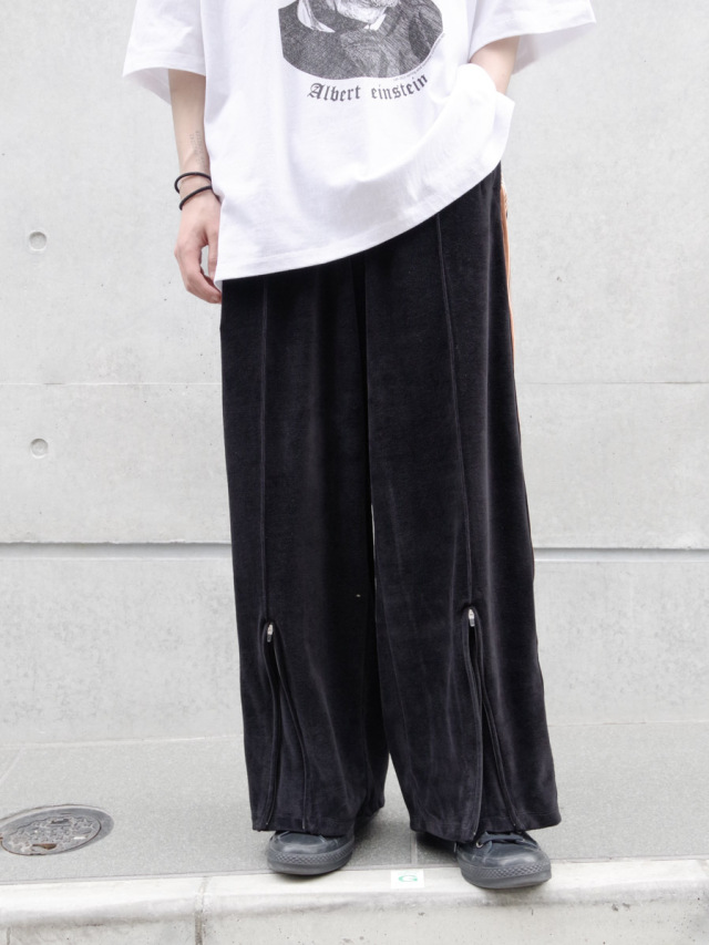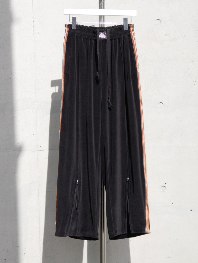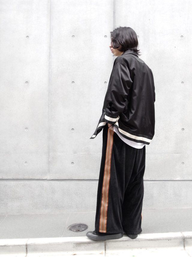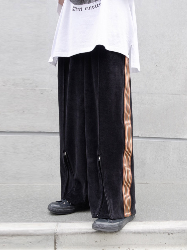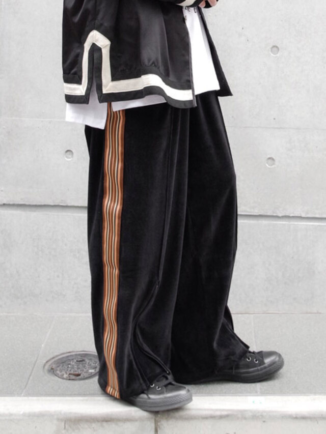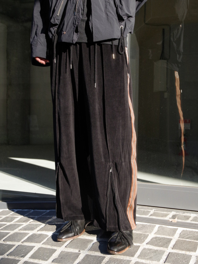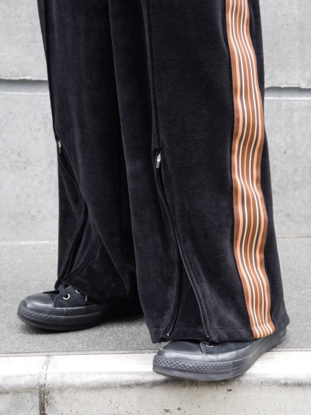 国内では取り扱いがなく、フランスから直接取り寄せたデッドストックの55mm幅太テープが目を引くワイドトラックパンツ。本作では上品なドレープが印象的なベルベット素材を採用。春夏用の清涼感ある薄手の素材で、上品さを残しつつもライトなタッチでスウェットのような素材感となっています。