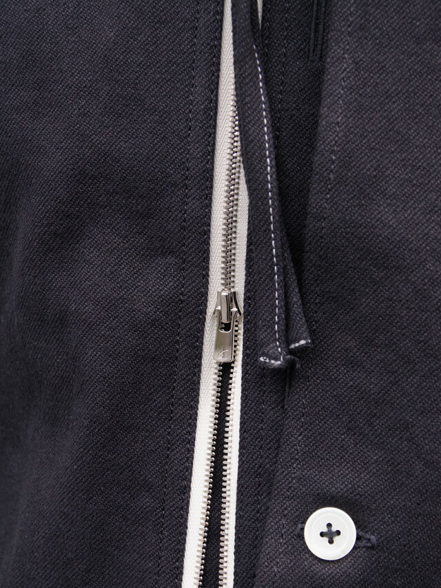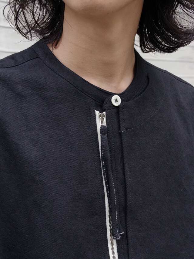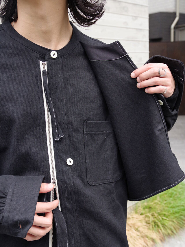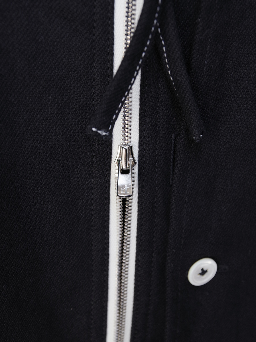 フェイクボタンホールや左胸にパッチ生地を加えたレイヤードなど各所に遊びが効いたディテール。前開きにはダブルジップのYKKエクセラファスナーが用いられています。