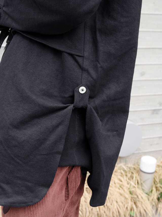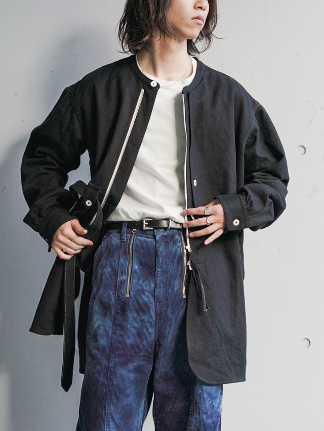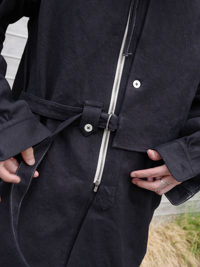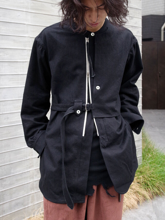 全体的にゆとりのあるサイズ感。右前のベルトにて身幅の調節を可能とし、アシンメトリーに見せる着用も。各所、パッカリング、タック、ギャザーを加えた細部までの拘りもポイント。