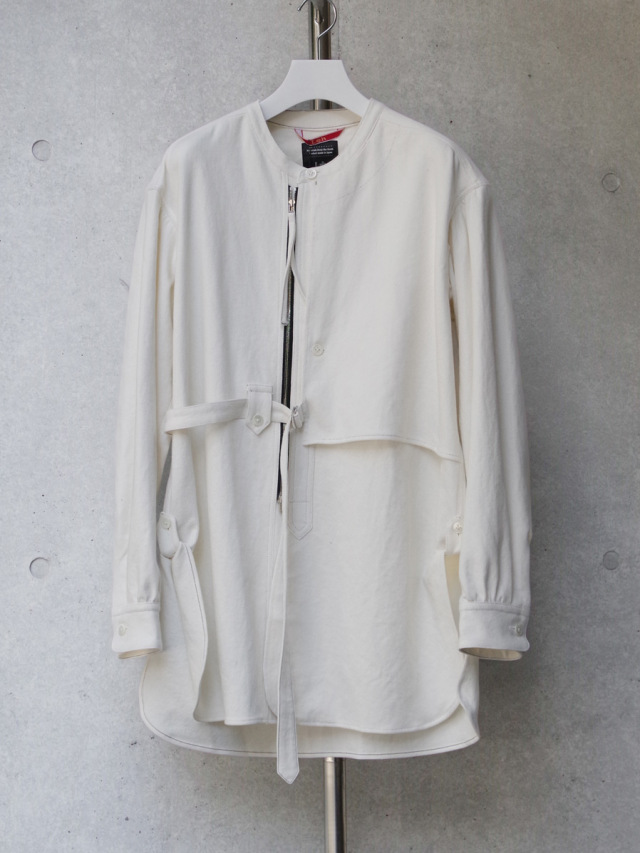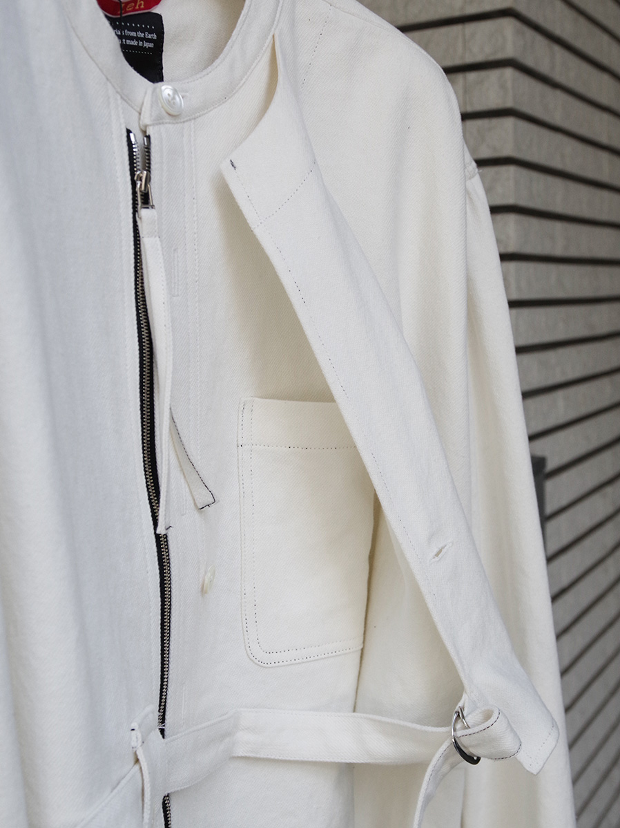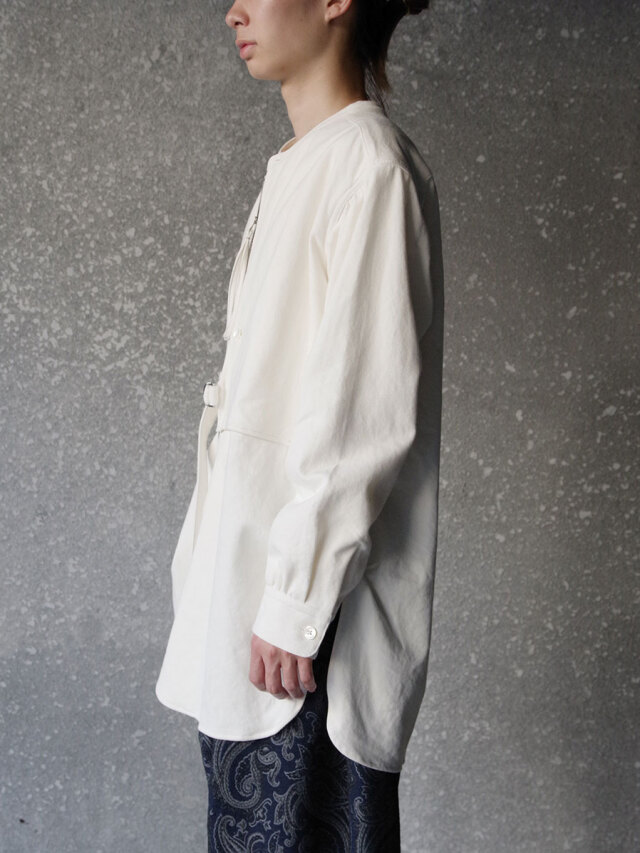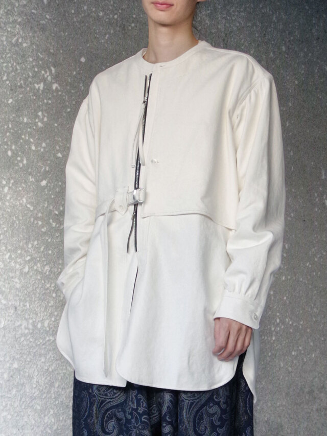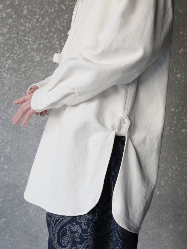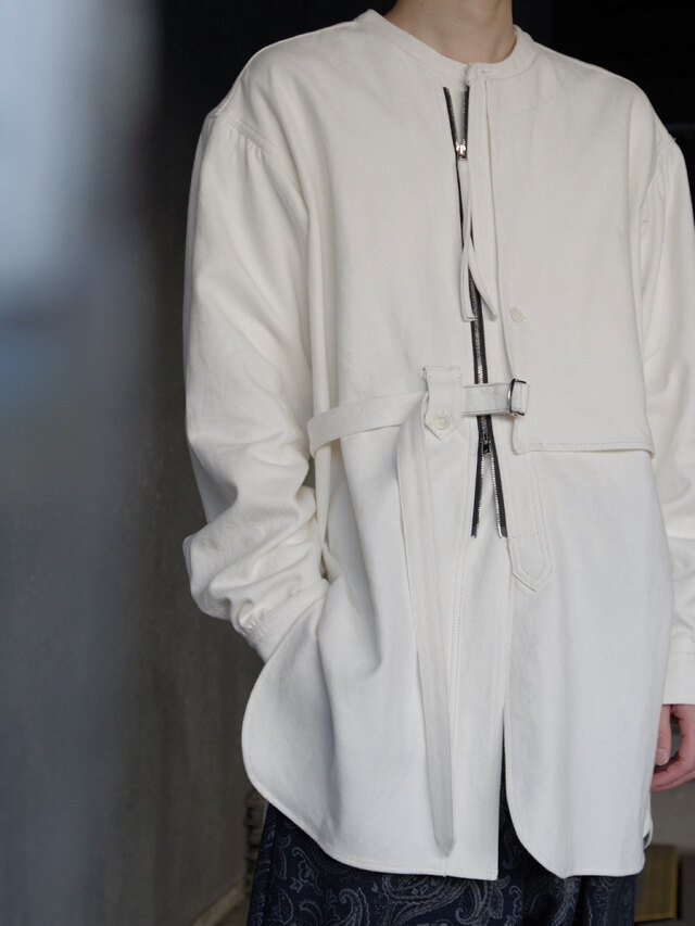 全体的にゆとりのあるサイズ感。右前のベルトにて身幅の調節を可能とし、アシンメトリーに見せる着用も。各所、パッカリング、タック、ギャザーを加えた細部までの拘りもポイント。