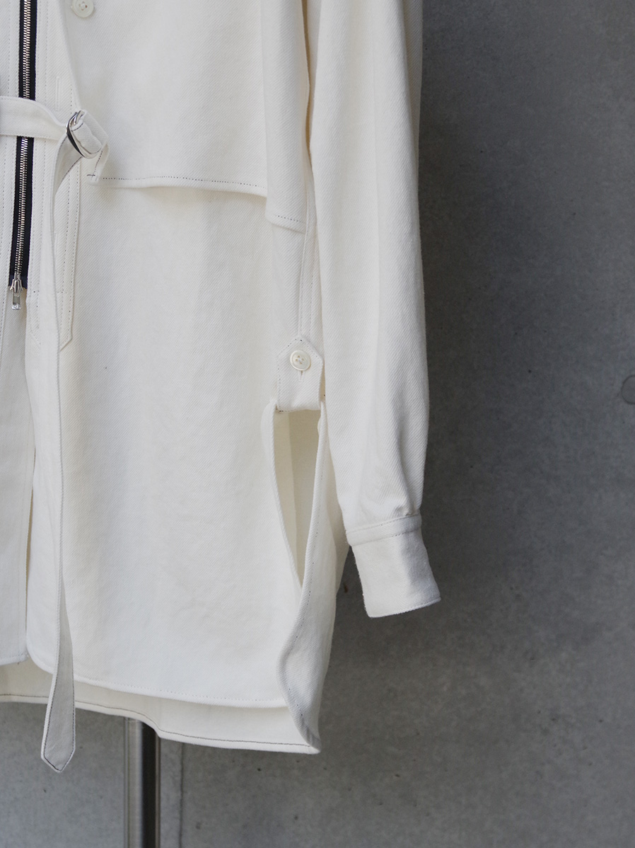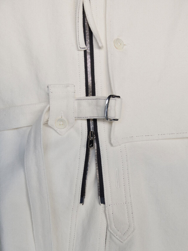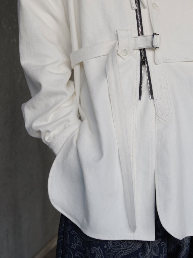 フェイクボタンホールや左胸にパッチ生地を加えたレイヤードなど各所に遊びが効いたディテール。前開きにはダブルジップのYKKエクセラファスナーが用いられています。