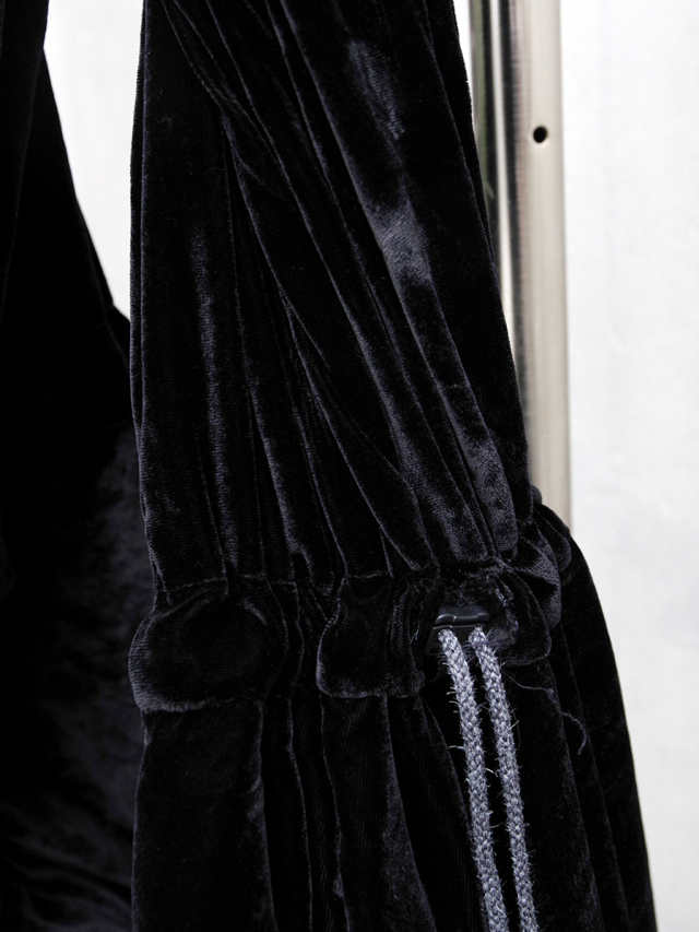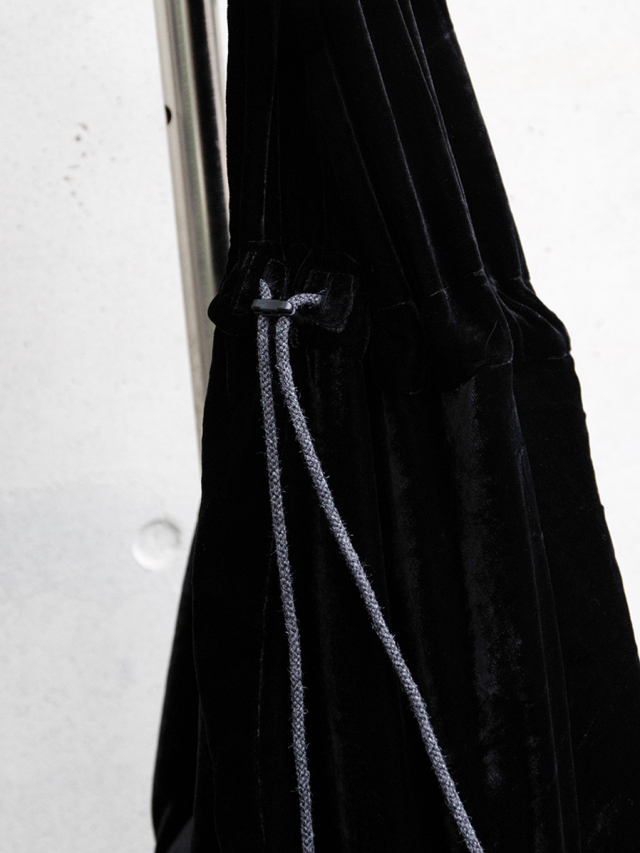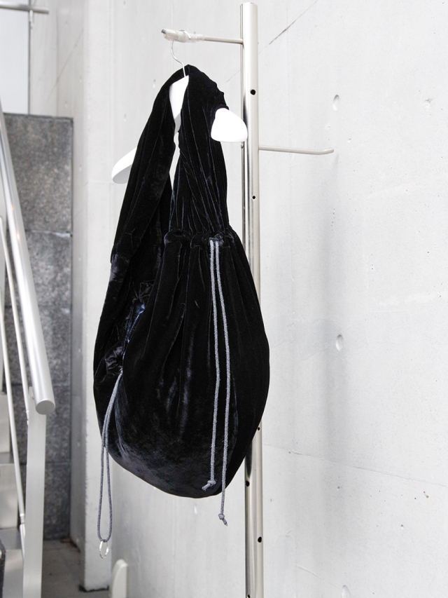 アジア圏の僧呂が身につける袈裟をデザインソースとした本作は、袋の入り口箇所と帯部分に設けられたドローコードでシルエットの調整が可能に。ドローコード先端には丸カンがつき、鍵などを取り付けるのにもぴったりで、内部には小分け用のポケットも配備されています。
