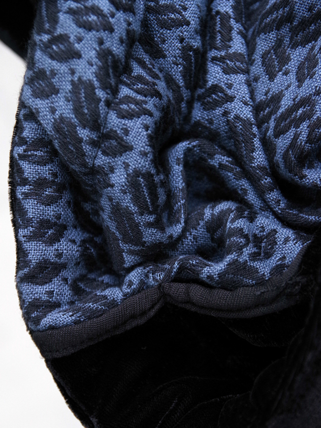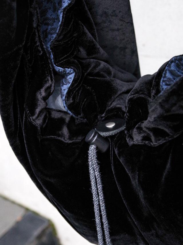 素材には希少価値の高いインド産のシルクベルベットを採用。シルクならではの美しい光沢としなやかな質感が備わり、見た目にも上質さが伝わる生地感となっています。裏地にはコットンアフガン柄生地をあてがい、細部までこだわりを感じさせます。