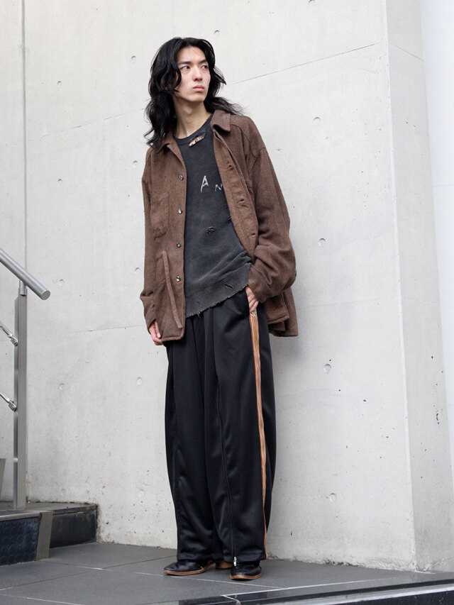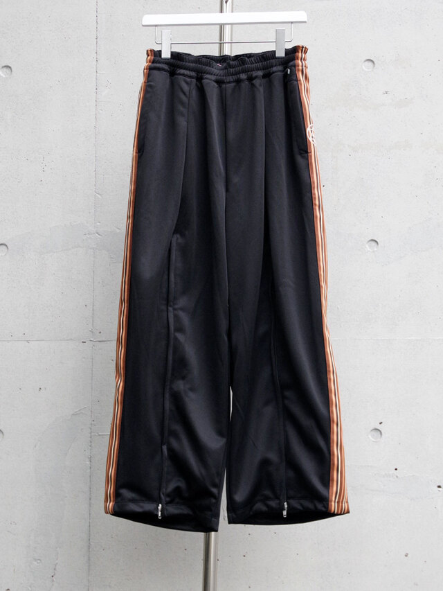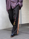 The zipper from below the knee to the hem is designed to reveal a vintage silk scarf when opened. Although they are track pants, they feature an elegant silhouette that incorporates a center press like slacks. Enjoy adjusting your silhouette with the zipper from below the knee to the hem.