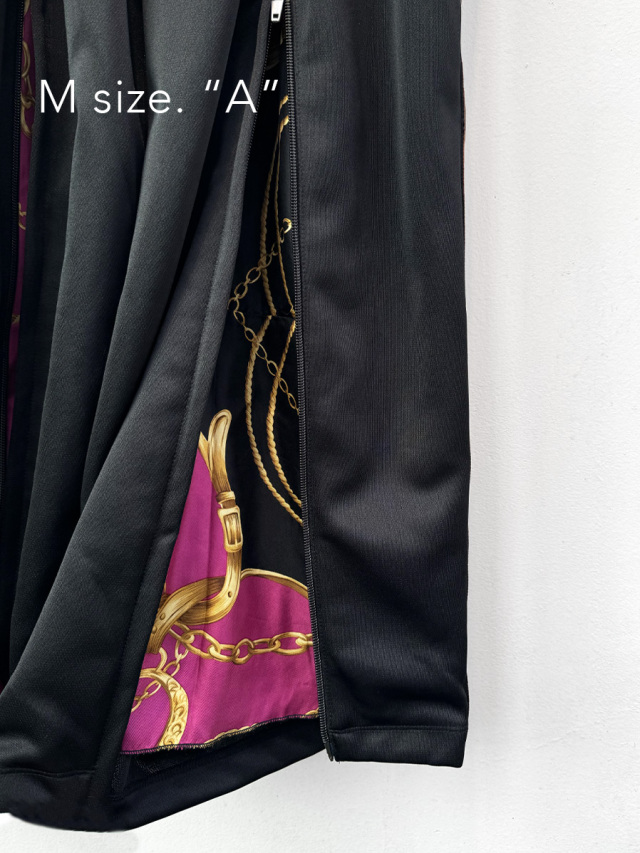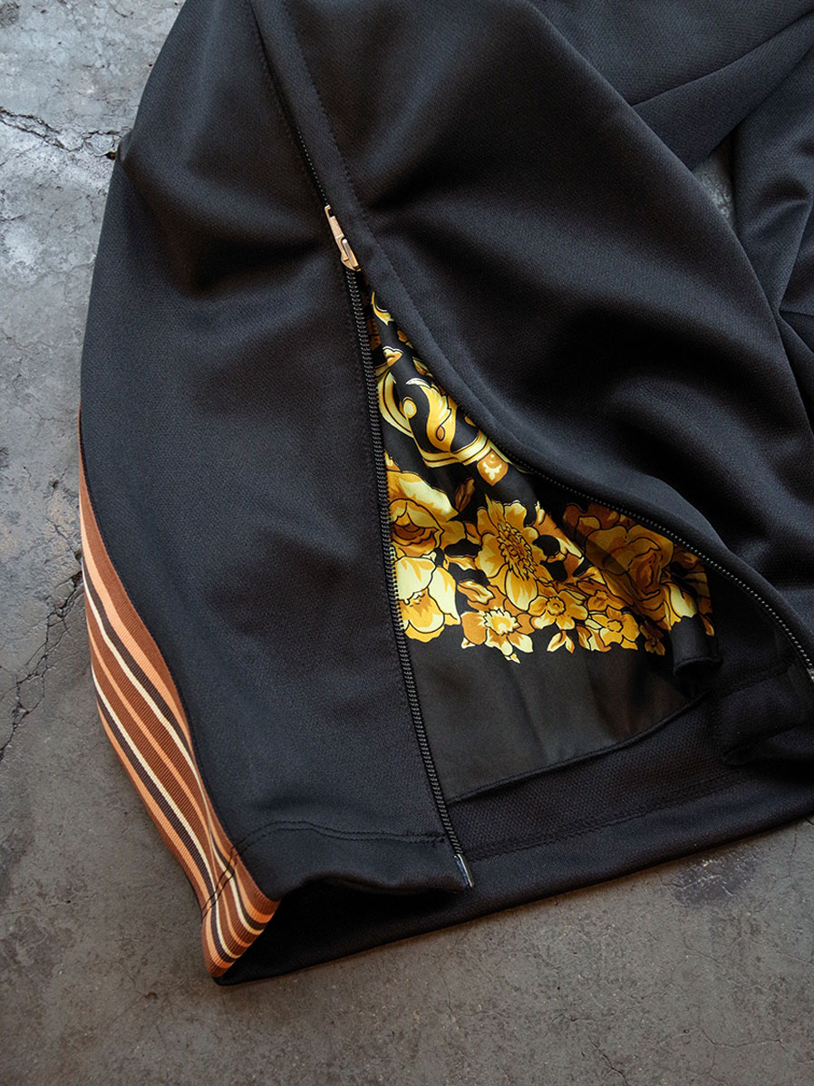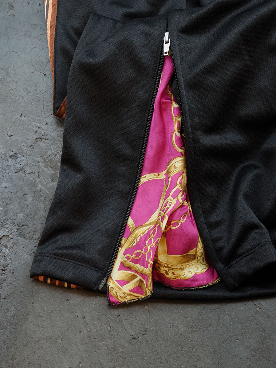 膝下から裾にかけてのファスナーは、開くとヴィンテージシルクスカーフが現れるデザインに。トラックパンツでありながら、スラックスの様にセンタープレスを取り入れた上品なシルエットが特徴的。膝下から裾にかけてのファスナーで、シルエットの調整をお楽しみいただけます。