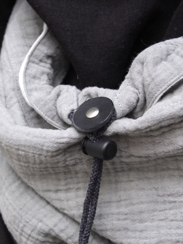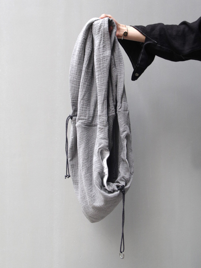 袋の入り口箇所と帯部分に設けられたドローコードでシルエットの調整が可能です。入り口箇所のドローコード先端には丸カンがつき、鍵などを取り付けるのにもぴったり。内部には小分け用のポケットも配備されています。