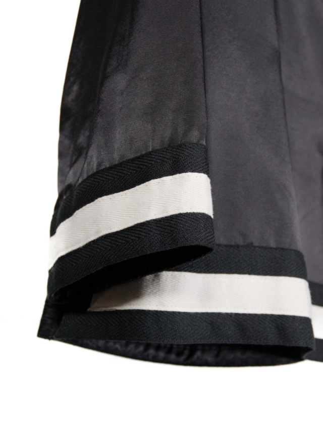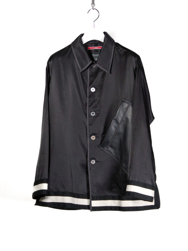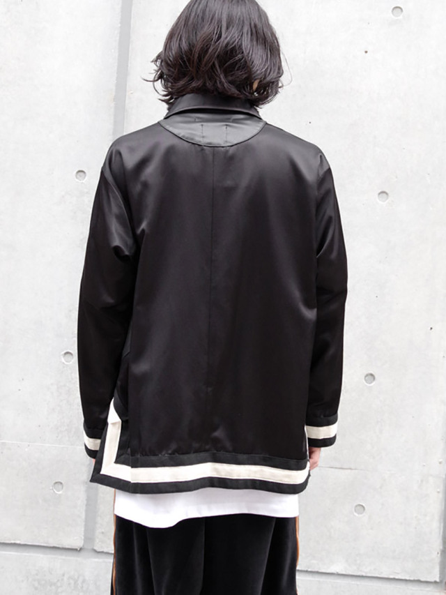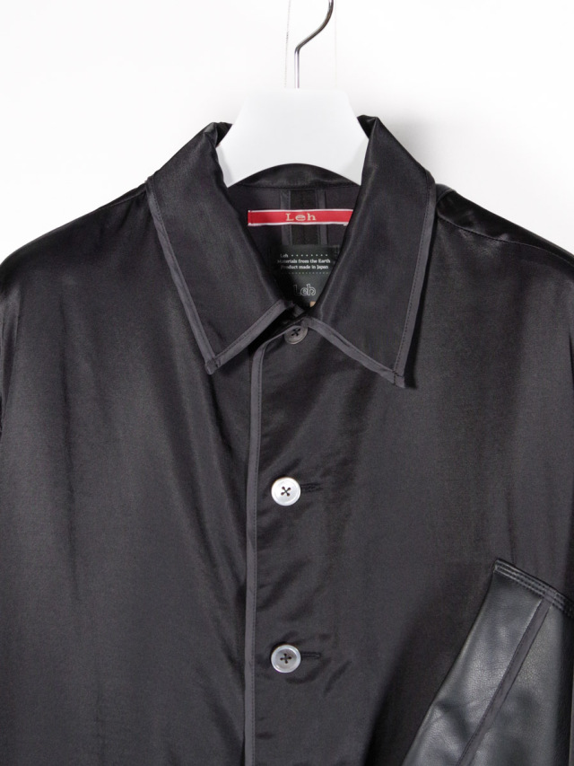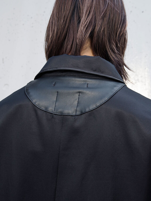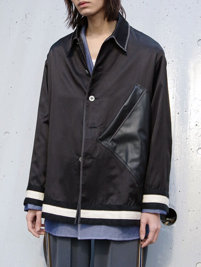 襟はオープンカラーで首元に抜け感をプラス。左フロントには大ぶりなフェイクレザーポケットを斜め付けし、アクセントに。前端はキュプラ素材のパイピング仕様で、細部に至るまでこだわりが凝縮された一着です。