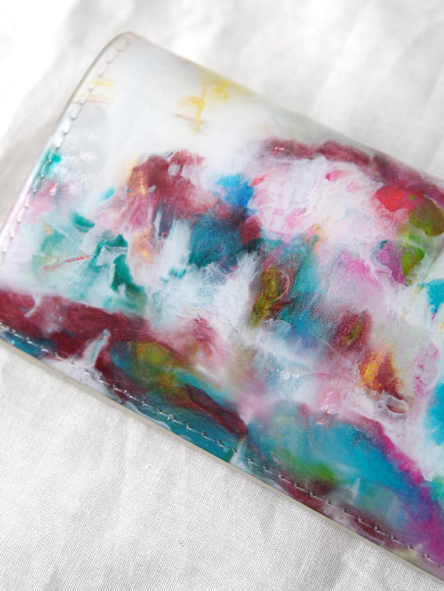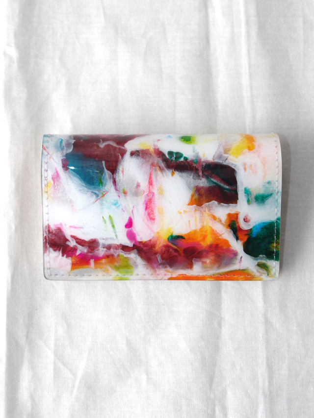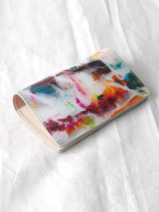 クリアなPVCの中に絵の具を溶き入れ、唯一無二の一点モノのグラフィックを表現。ナチュラルなレザーと合わさることで、異素材同士が美しく調和し一つの世界観を生み出します。