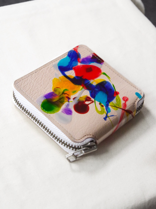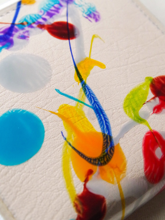 クリアなPVCの中に絵の具を溶き入れ、唯一無二の一点モノのグラフィックを表現。ナチュラルなレザーと合わさることで、異素材同士が美しく調和し一つの世界観を生み出します。