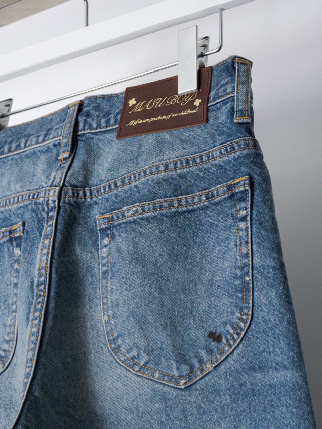 Along with an original top button, the pants are finished with an oil leather patch embossed in gold foil, featuring a quote from a legendary pop star. While drawing from vintage denim references, the updated form and details express the brand’s distinctive originality.