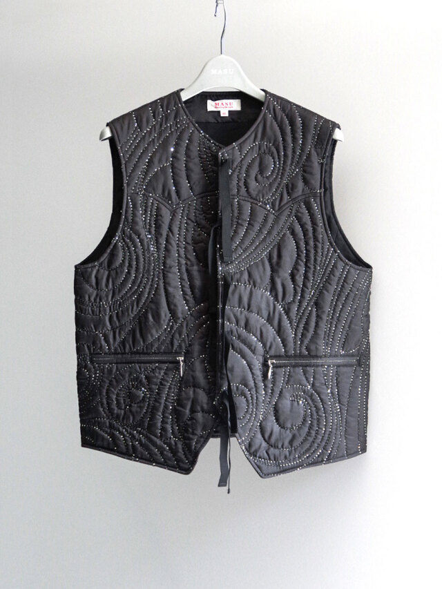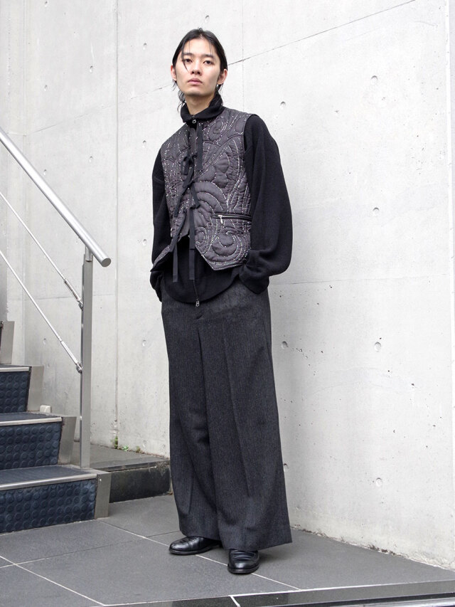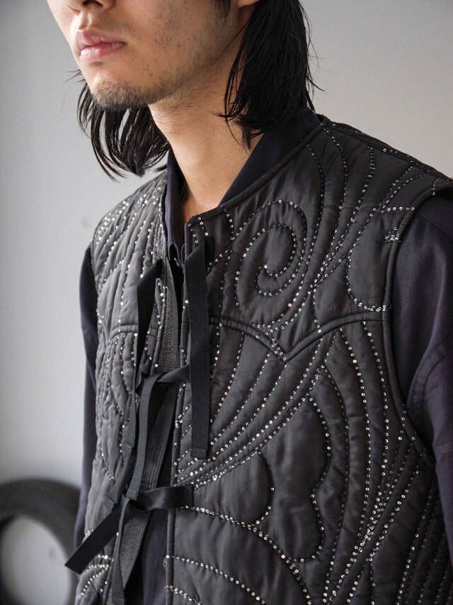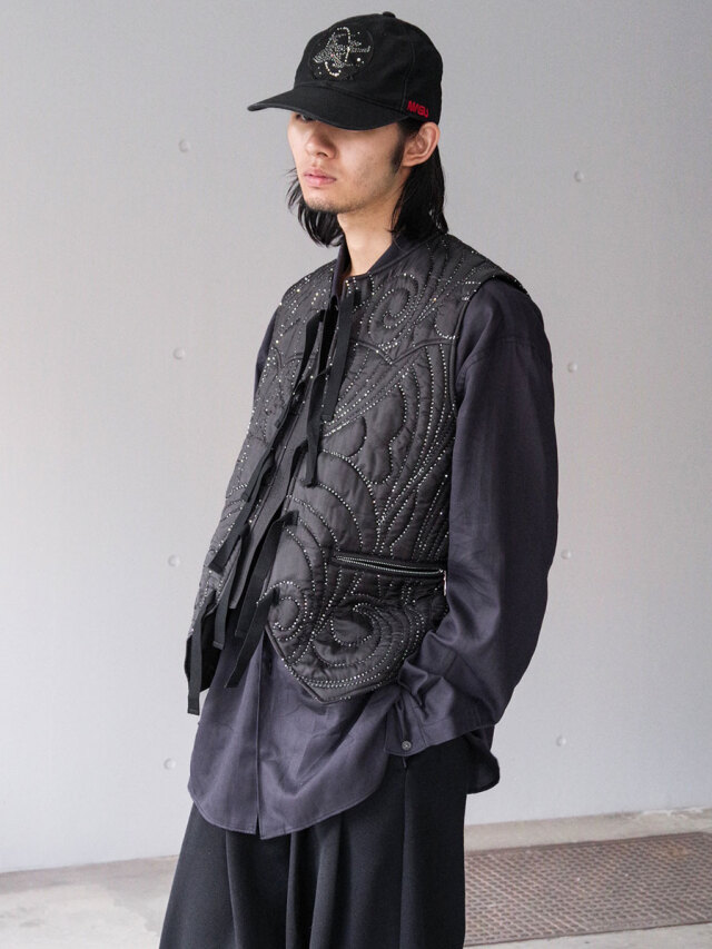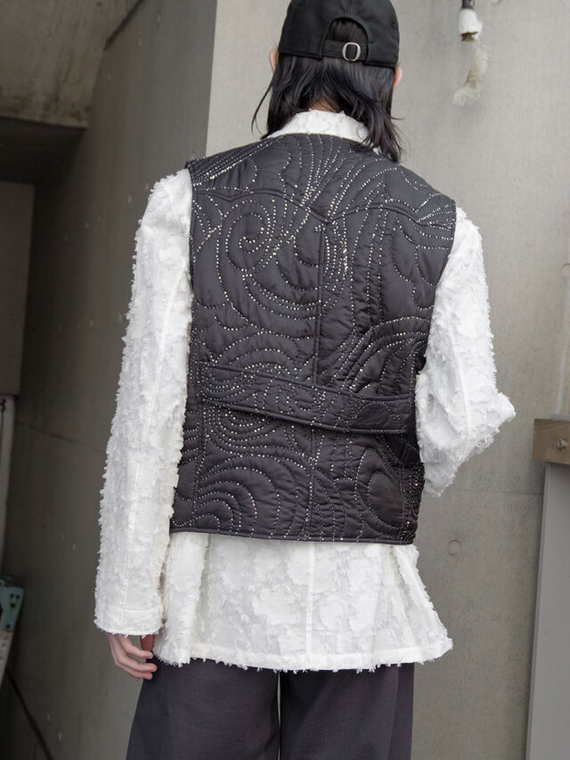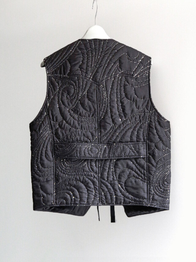 Based on the quilted jacket introduced in the FW2021 collection, this design has been reimagined as a vest. Drawing inspiration from military liner jackets, the silhouette is paired with a psychedelic 1970s-inspired pattern, rendered across the surface through intricate quilting.
