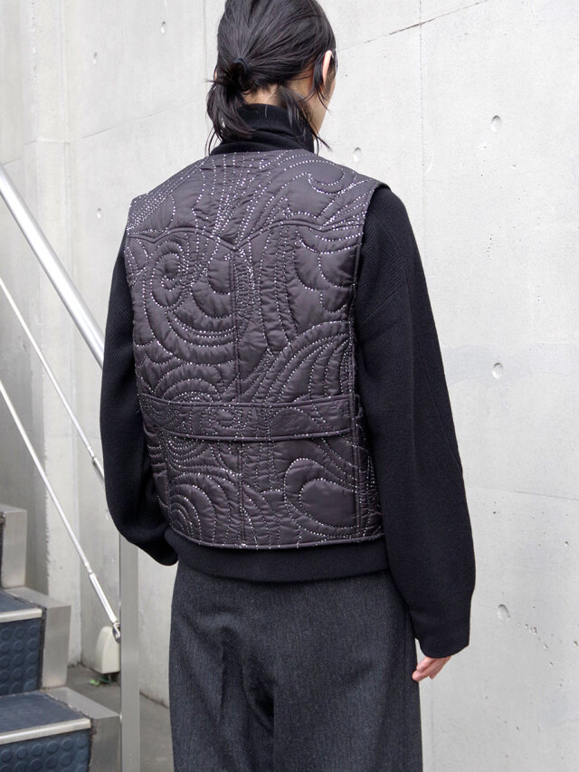 総柄の大胆なデザインが目を引くキルティングベスト。