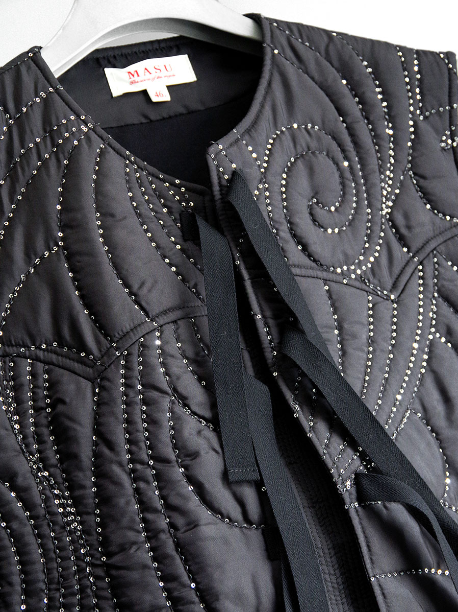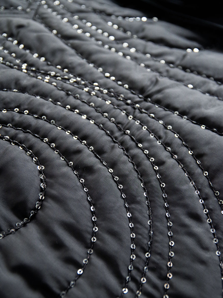 キルティングのステッチには、スパンコールが巻きついた特別な糸を使用。独自のドリーミーな輝きが加わることで、ブランドらしい遊び心が息づく一着に仕上がっています。