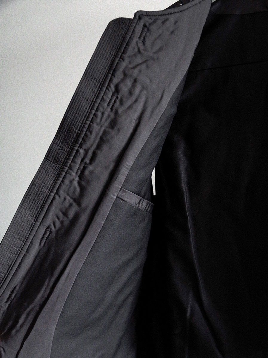 鈍い光沢を放つキュプラサテンを表地に使用し、しなやかで上質な質感を備えています。