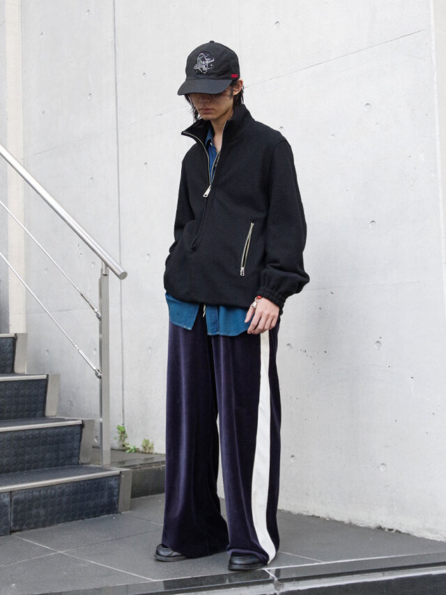 同素材のトラックジャケットとのセットアップスタイルもおすすめです。