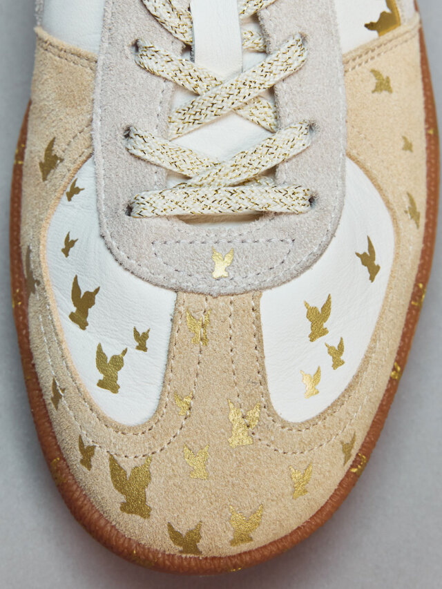 The gold-laced shoelaces add a subtle shimmer, while an additional off-white lace offers a more understated option.