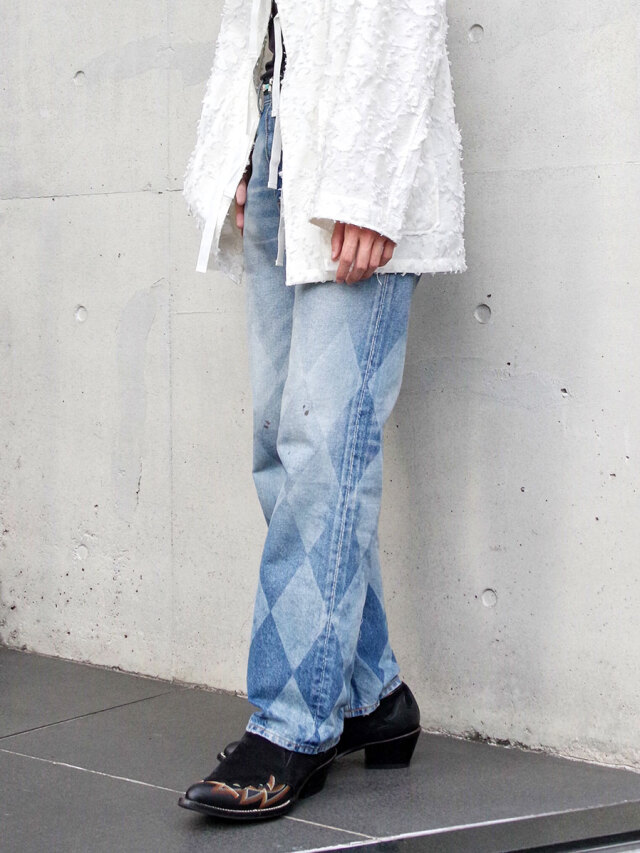 腿から裾にかけて浮かび上がるアーガイル柄は、レーザーブリーチによって表現。