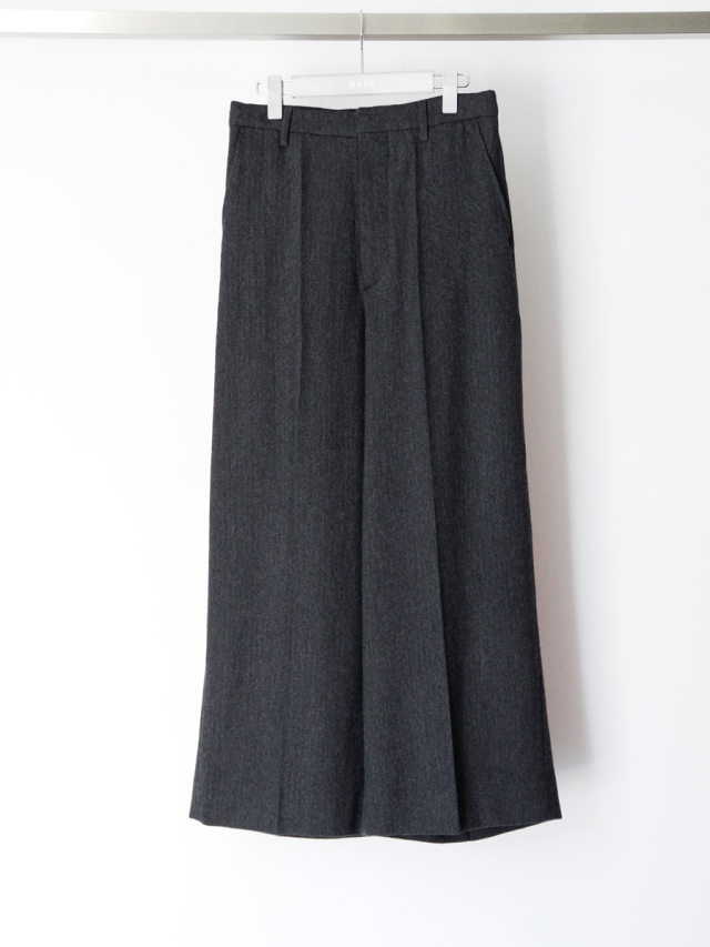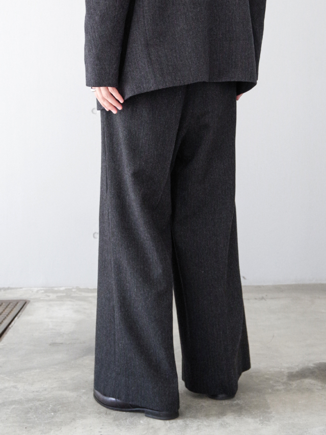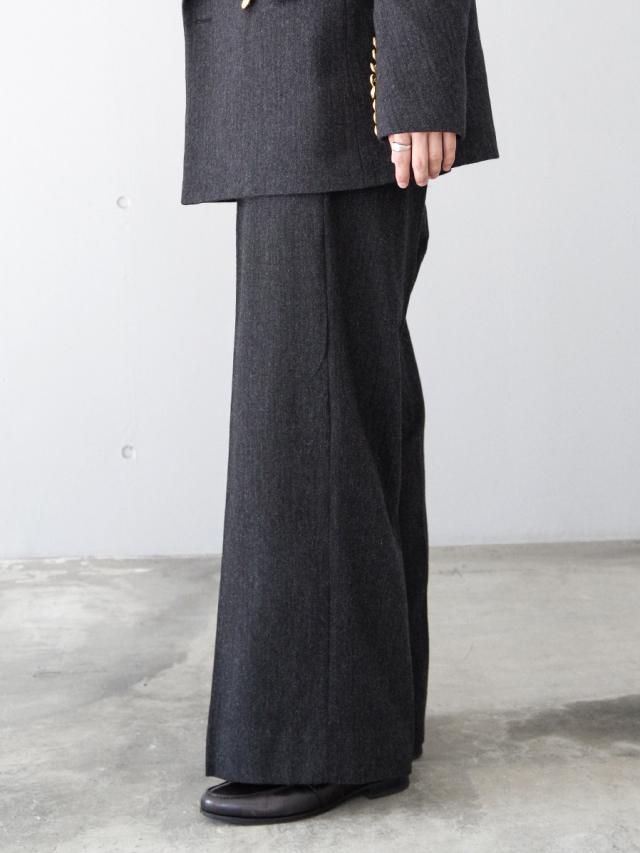 Wide silhouette trousers crafted from a classic herringbone suiting fabric. Based on the trousers introduced in the FW24 collection with tonal initial patches, this piece continues the brand’s signature wide silhouette while refining the pattern for a more sophisticated and balanced look.