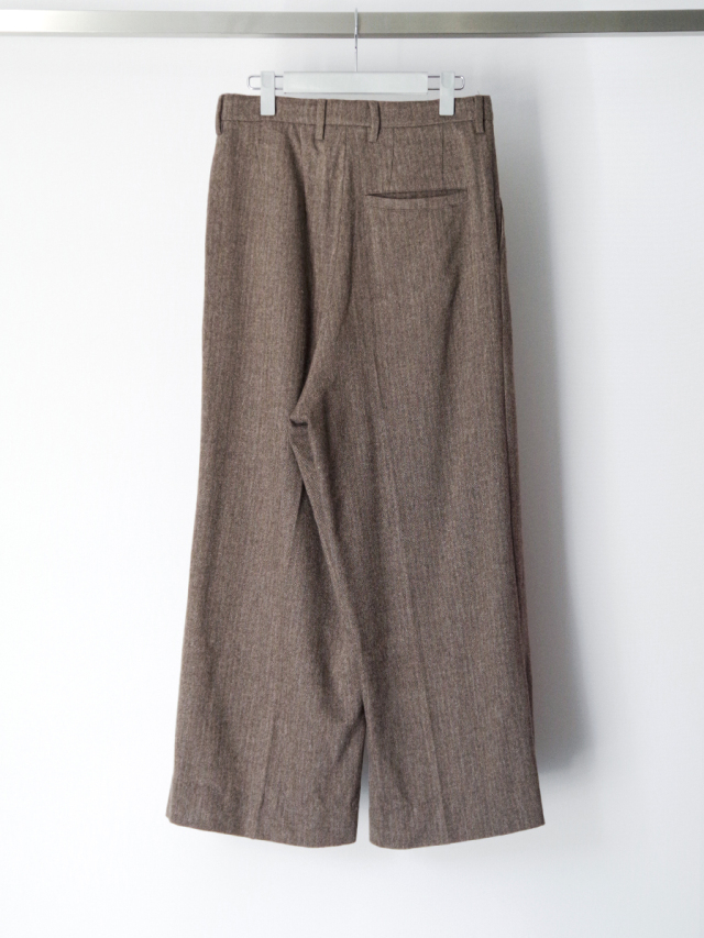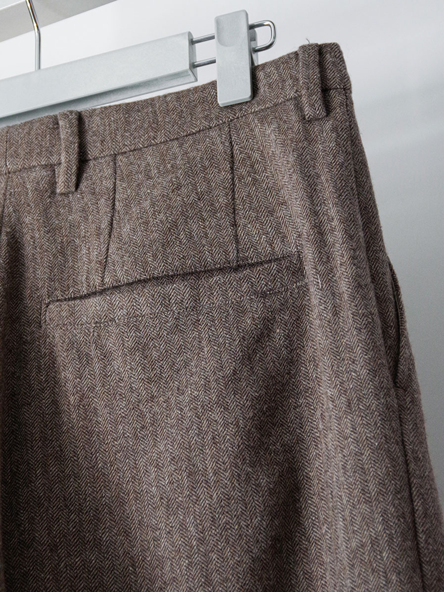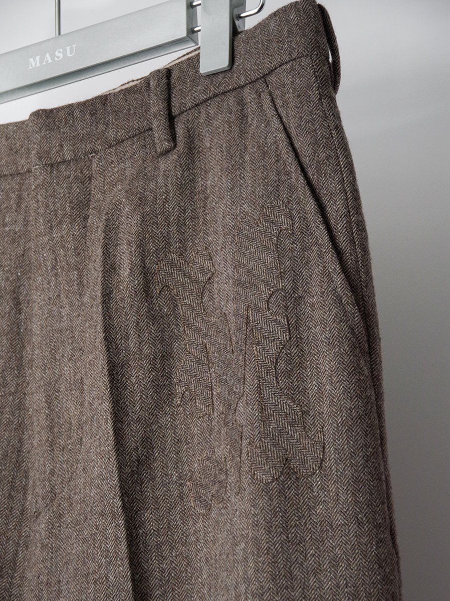 Wide silhouette trousers crafted from a classic herringbone suiting fabric. Based on the trousers introduced in the FW24 collection with tonal initial patches, this piece continues the brand’s signature wide silhouette while refining the pattern for a more sophisticated and balanced look.