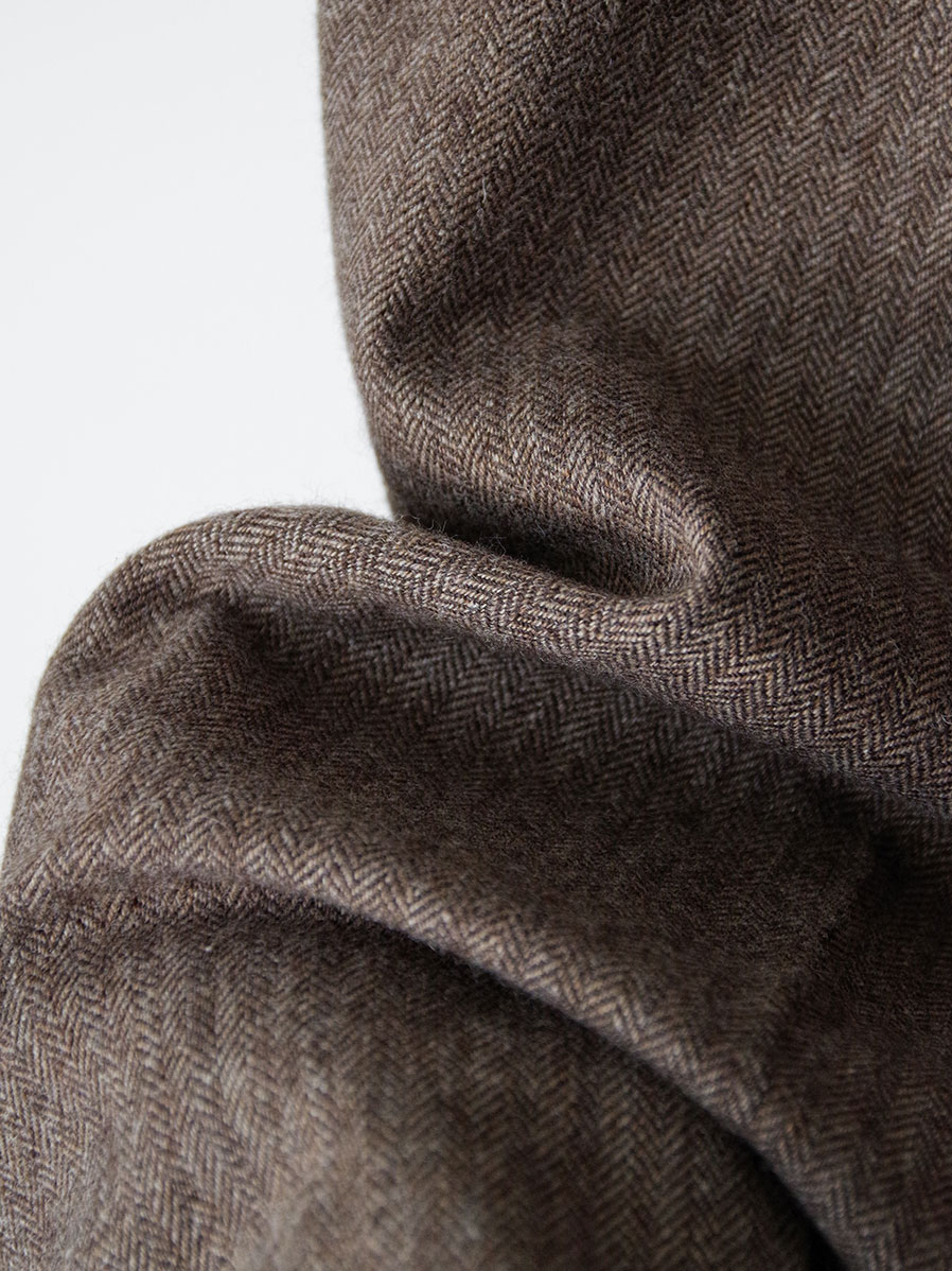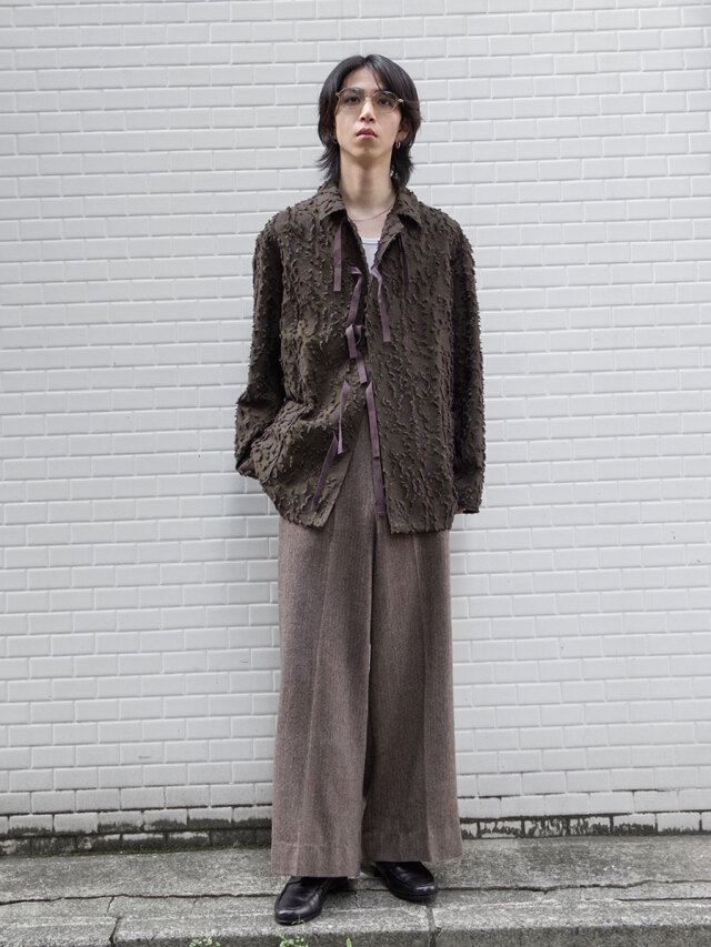 クラシックなヘリンボーン組織のスーツ地を使用し、落ち着いた雰囲気を漂わせます。FW24コレクションで登場した、共布のイニシャルワッペン付きトラウザーズをベースにデザイン。ブランドが継続的に発表してきたワイドシルエットを継承しつつ、今季はパターンを微調整することで、より洗練されたバランスにアップデートされています。